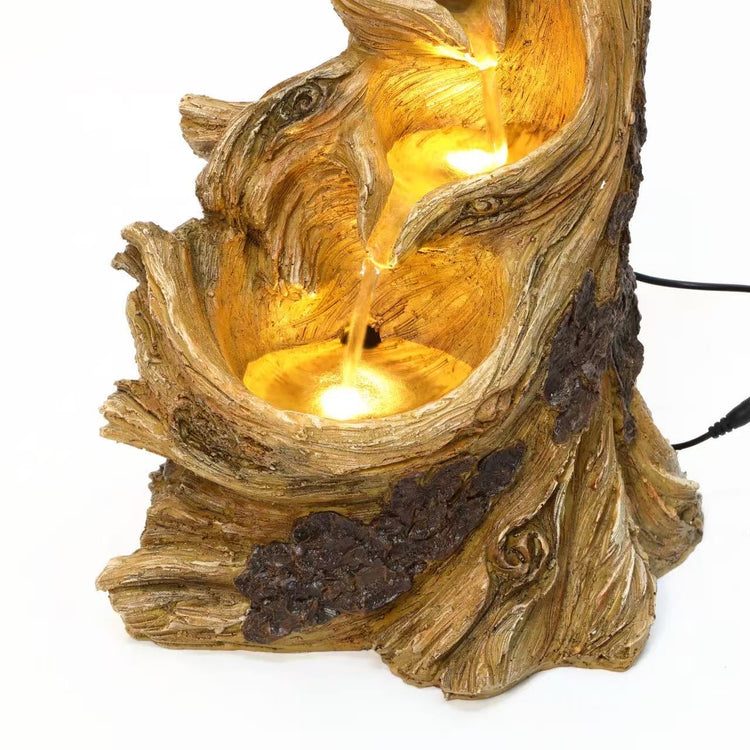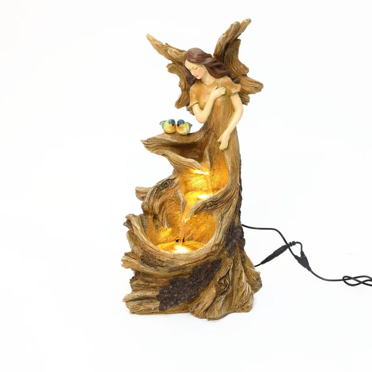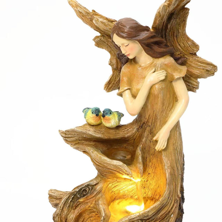 A Table Fountain with a fairy, two birds, and wooden finish effect with lights serves as a compact, enchanting indoor or patio decor piece. It blends whimsical fantasy elements with a rustic wood-like texture, illuminated by soft LED lights for magical evening ambiance. Ideal for small spaces in homes or e-commerce display in your Australian business.
