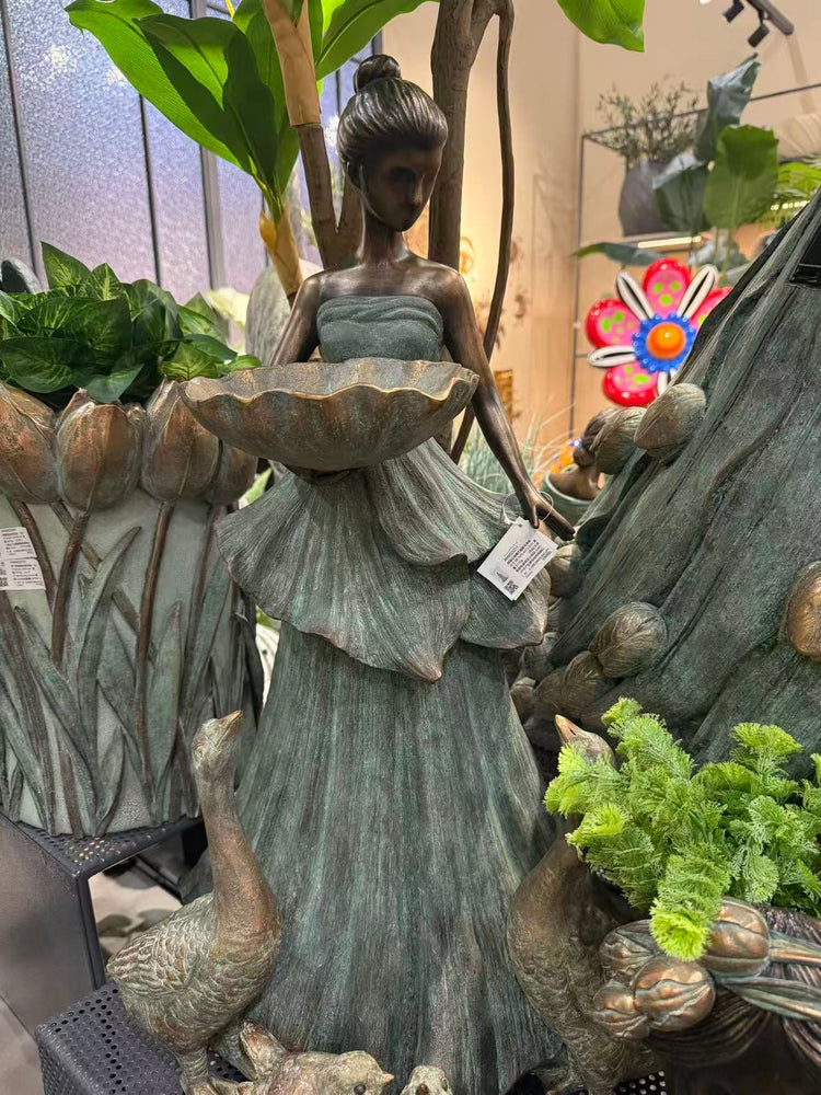 Outstanding elegant feminine lady posing in an intimate reflecting moment. Holding a birdbath in majestic Copper colour with 2 geese.