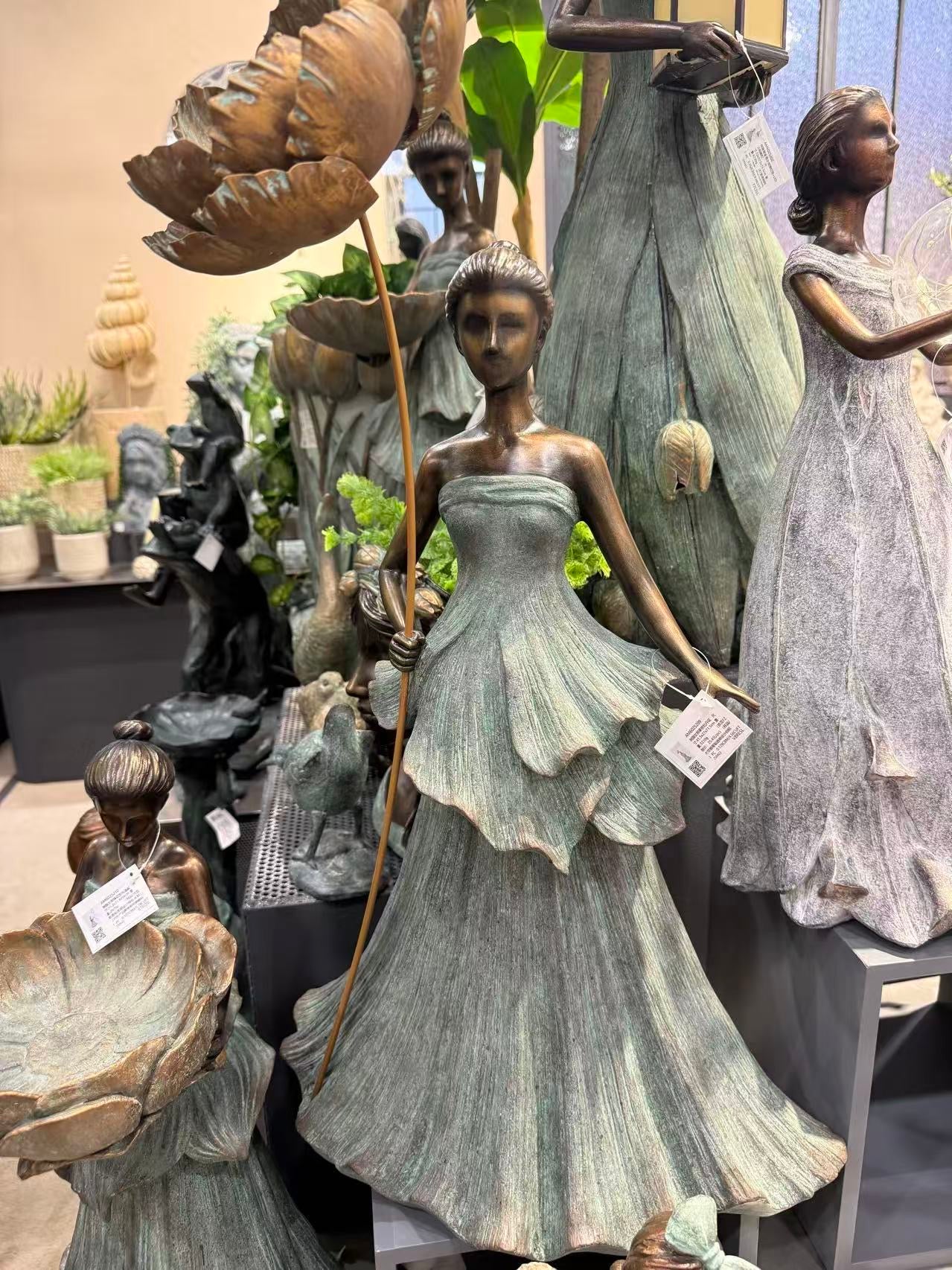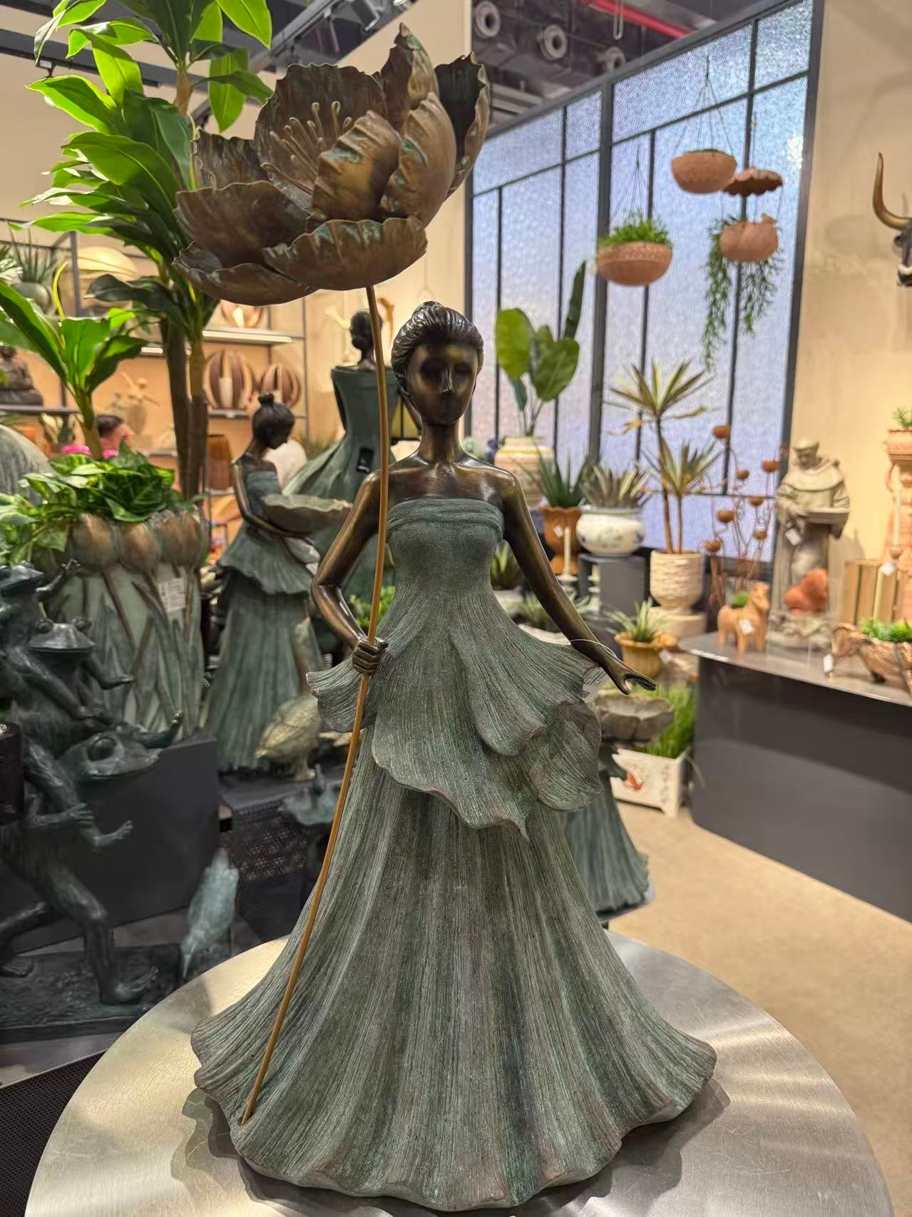 Outstanding elegant feminine lady posing in an intimate reflecting moment. Holding a large flower in majestic Copper colour.