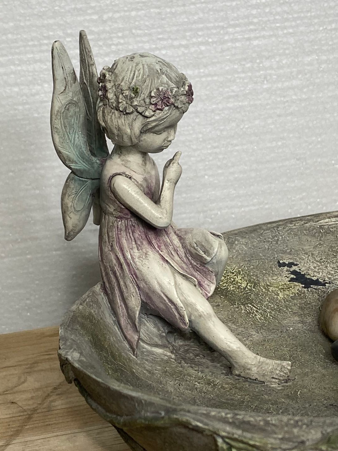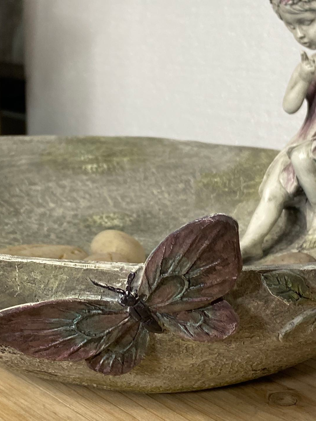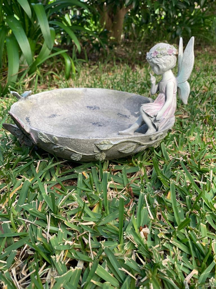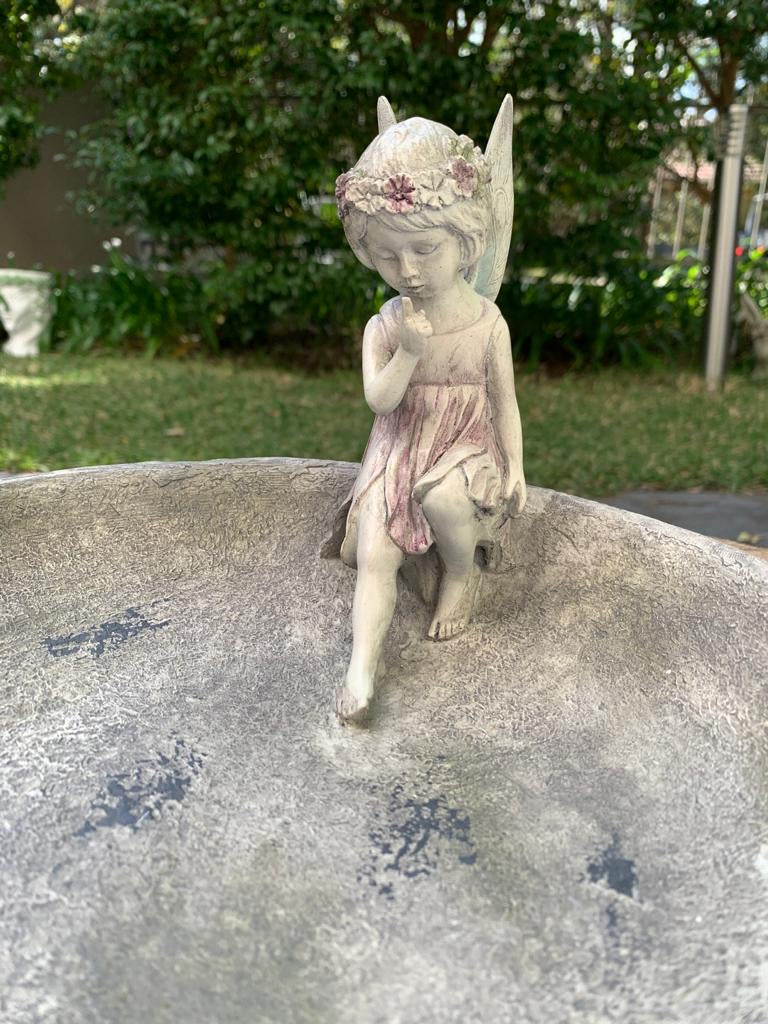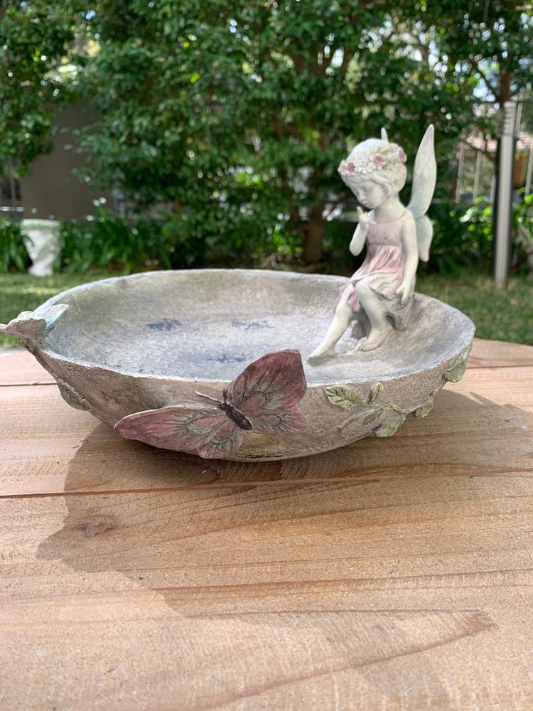 Pixie is an angelic bird feeder / bird bath with butterflies in blue - pink fading colours.