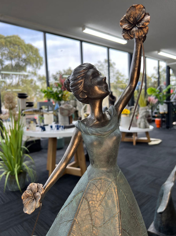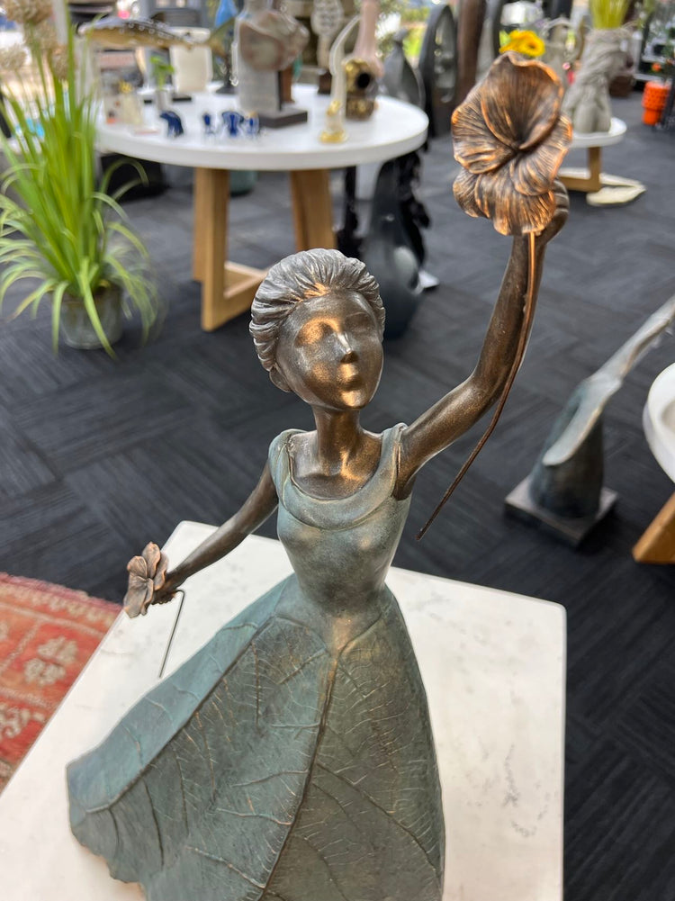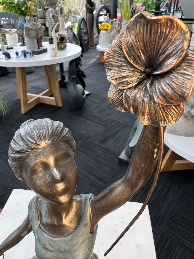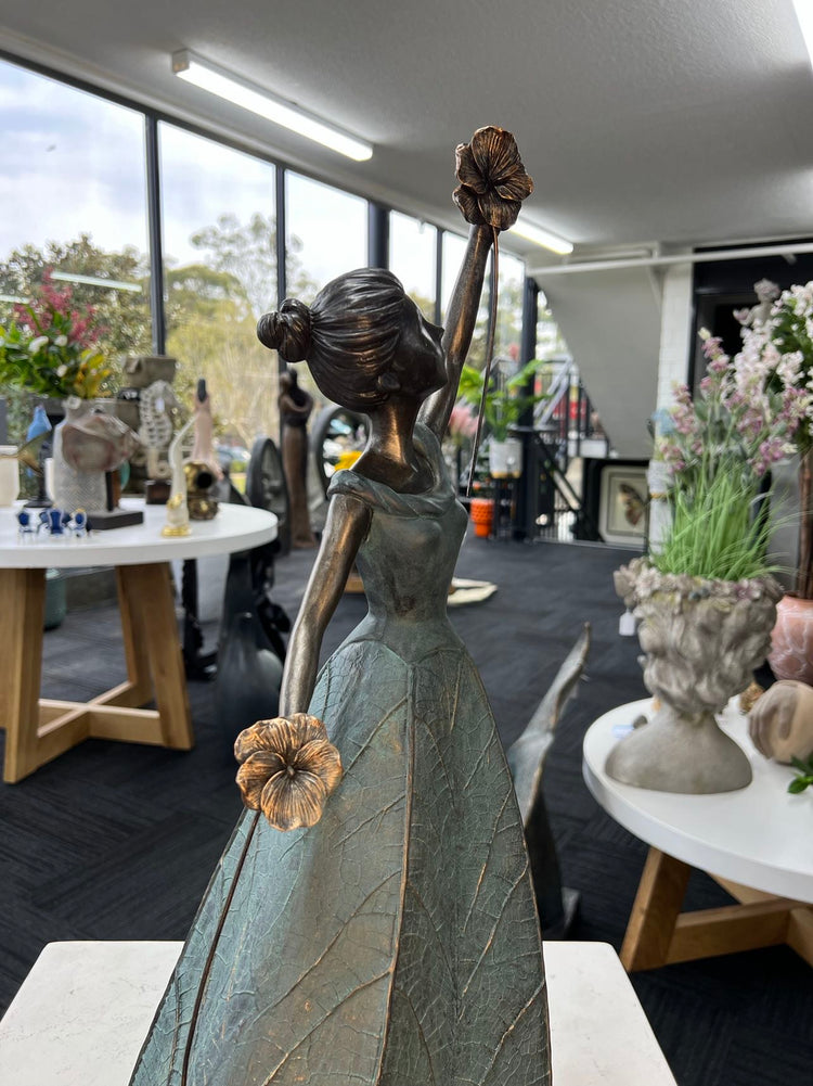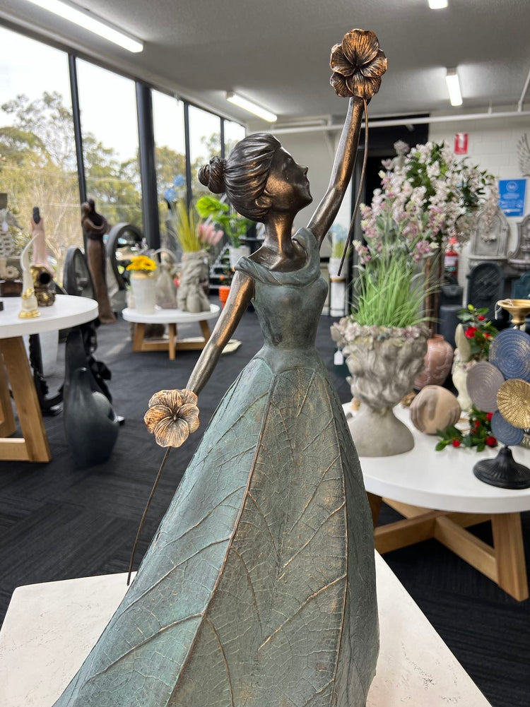 Outstanding elegant feminine lady posing in an intimate reflecting moment. Holding a Hibiscus Flowers in majestic Copper colour with metal stem.