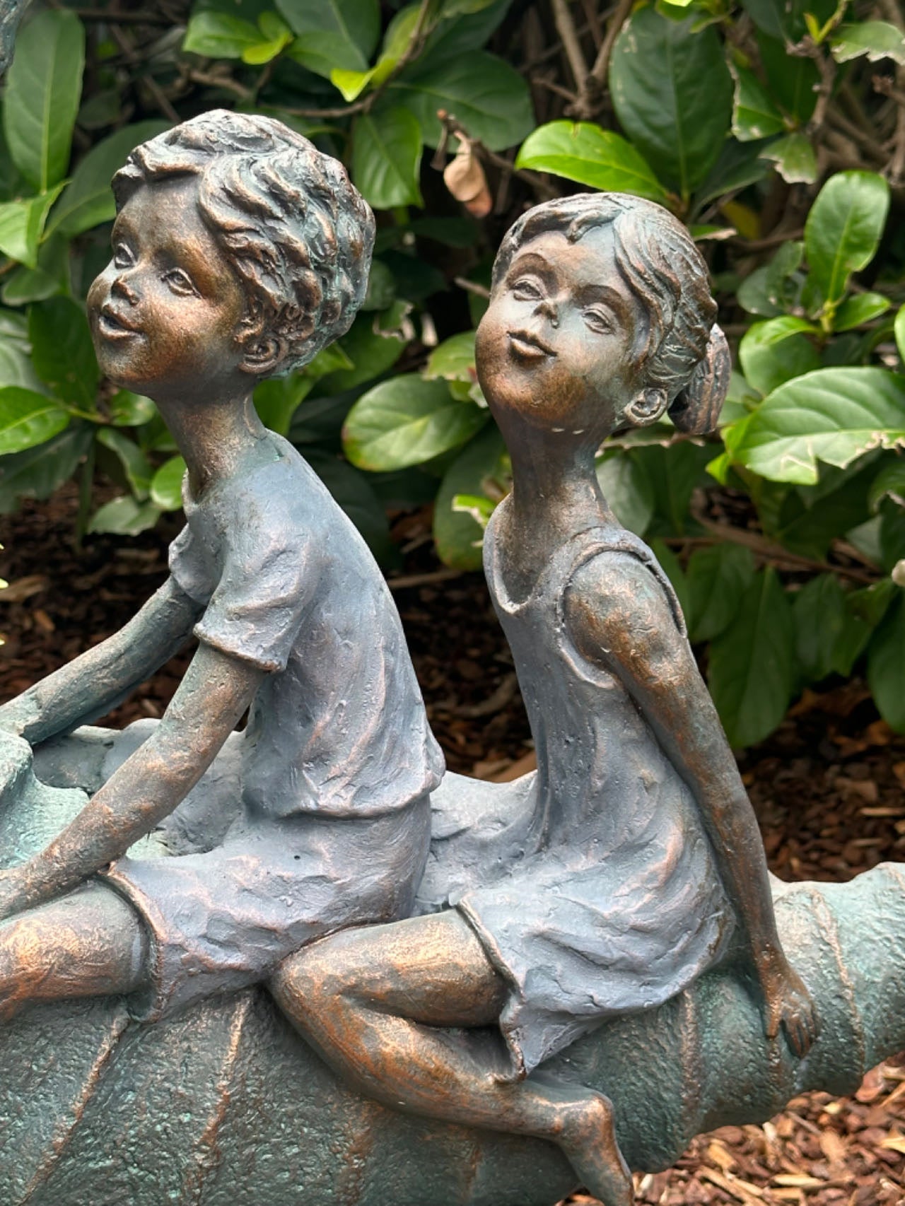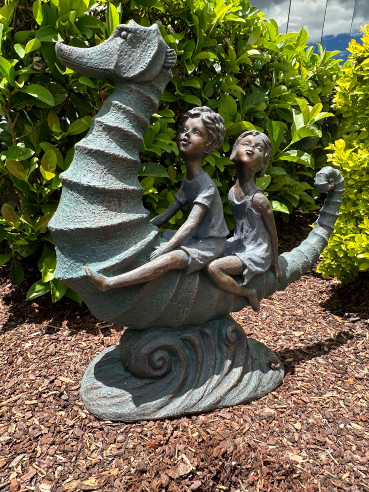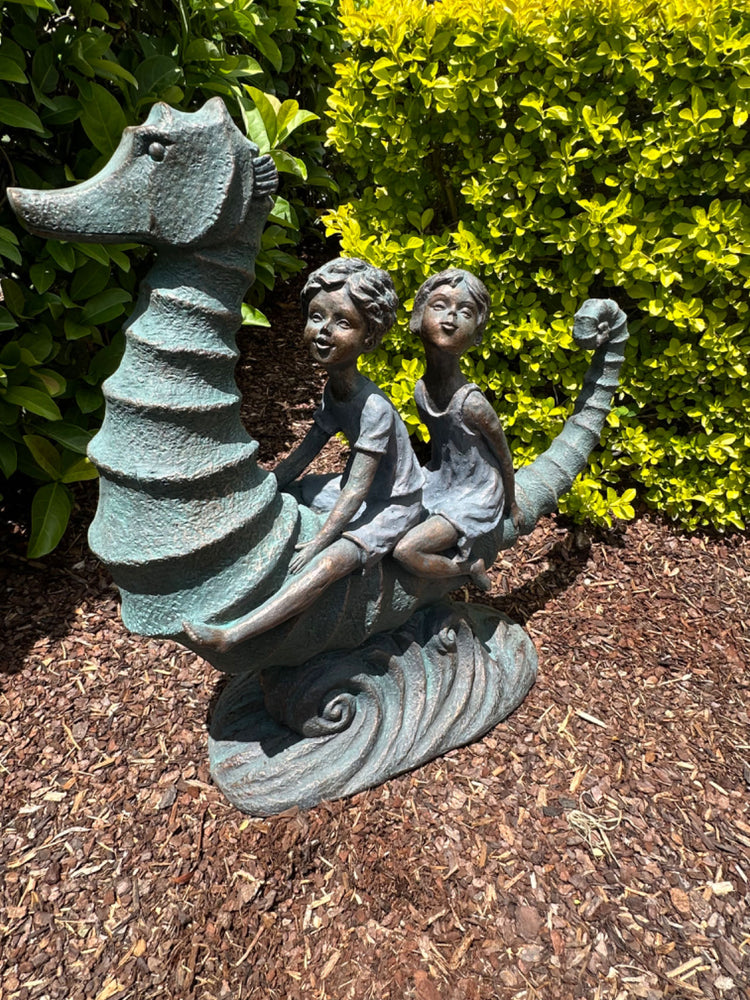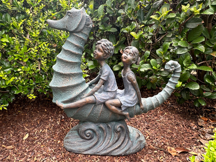 Explorers is a Statue Featuring Boy & Girl riding a seahorse in the wild, true abstract representation of childhood and innocent imagination.