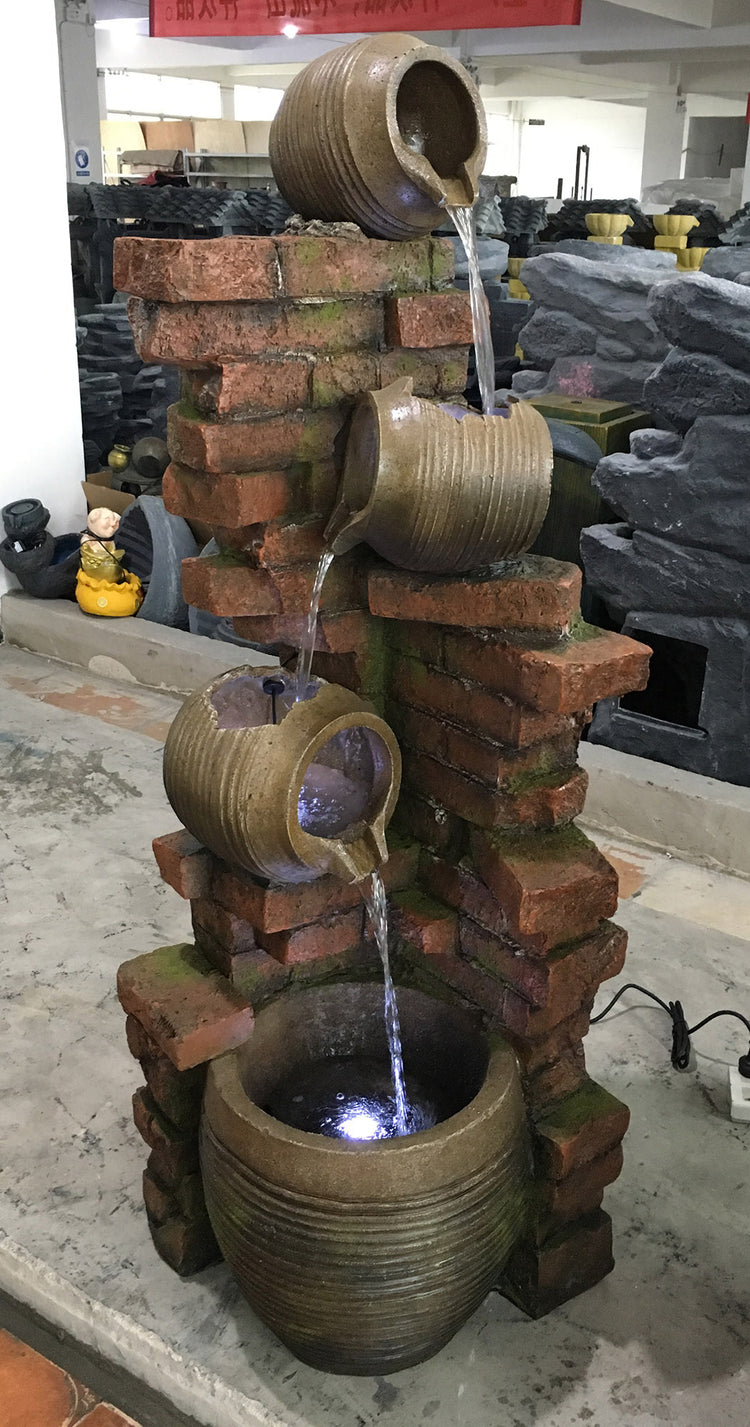 The waterfall is enhanced by powerful integrated LED lights, creating a calm and peaceful atmosphere as it gently flows through the pots / jugs down to the Bottom Large Pot beneath. Simply remove from the box, add water, connect to a power source and within a few minutes you will have a relaxing, modern addition to your garden or home.