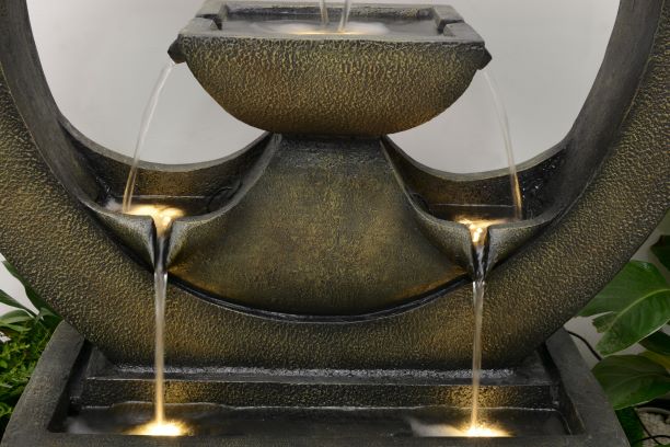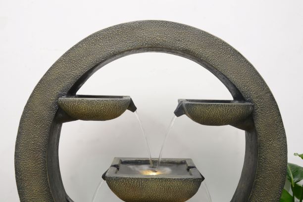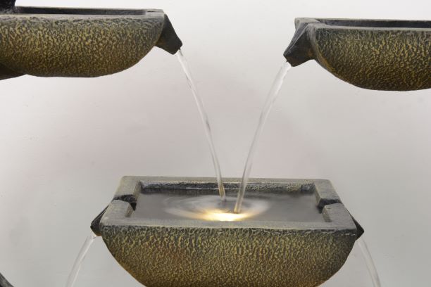 The water circulates from a reservoir hidden inside the feature and is pumped out of the top symmetrical bowls, before gently spilling down the lower levels through the final tier into the beautiful rectangle base, ready to be pumped back up to start the cycle all over again.