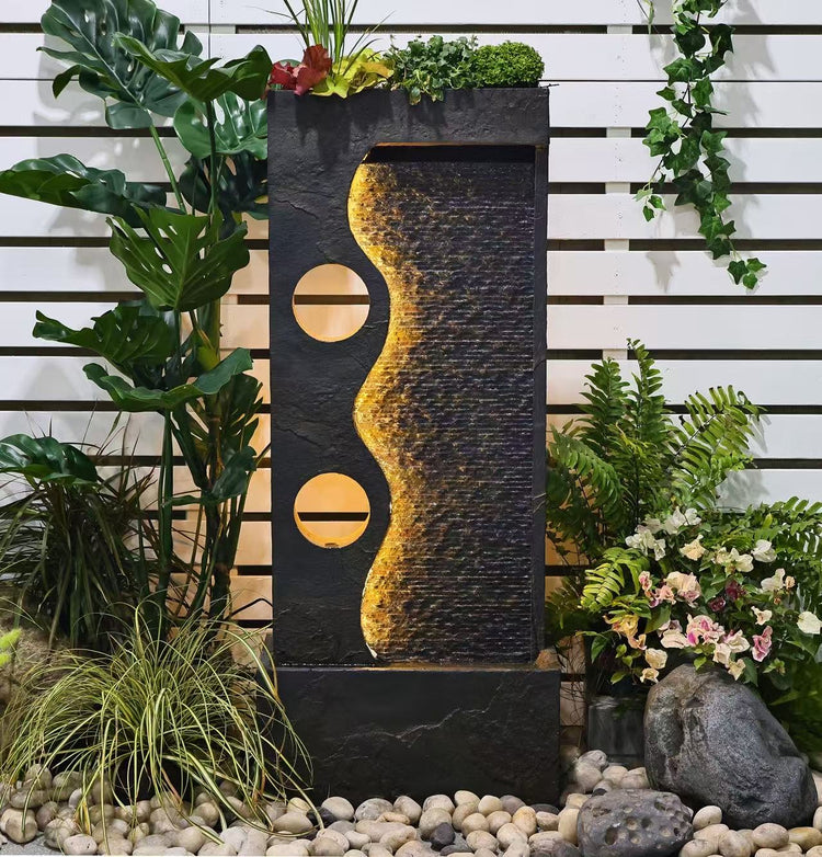The water wall is enhanced by powerful integrated LED lights, creating a calm and peaceful atmosphere as it gently flows through the many levels & cavities / bricks down the wall feature. Simply remove from the box, add water, connect to a power source and within a few minutes you will have a relaxing, modern addition to your garden or home.