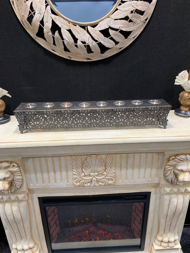 This is a long feature that is table top with hanging 8 glass candle holder inside