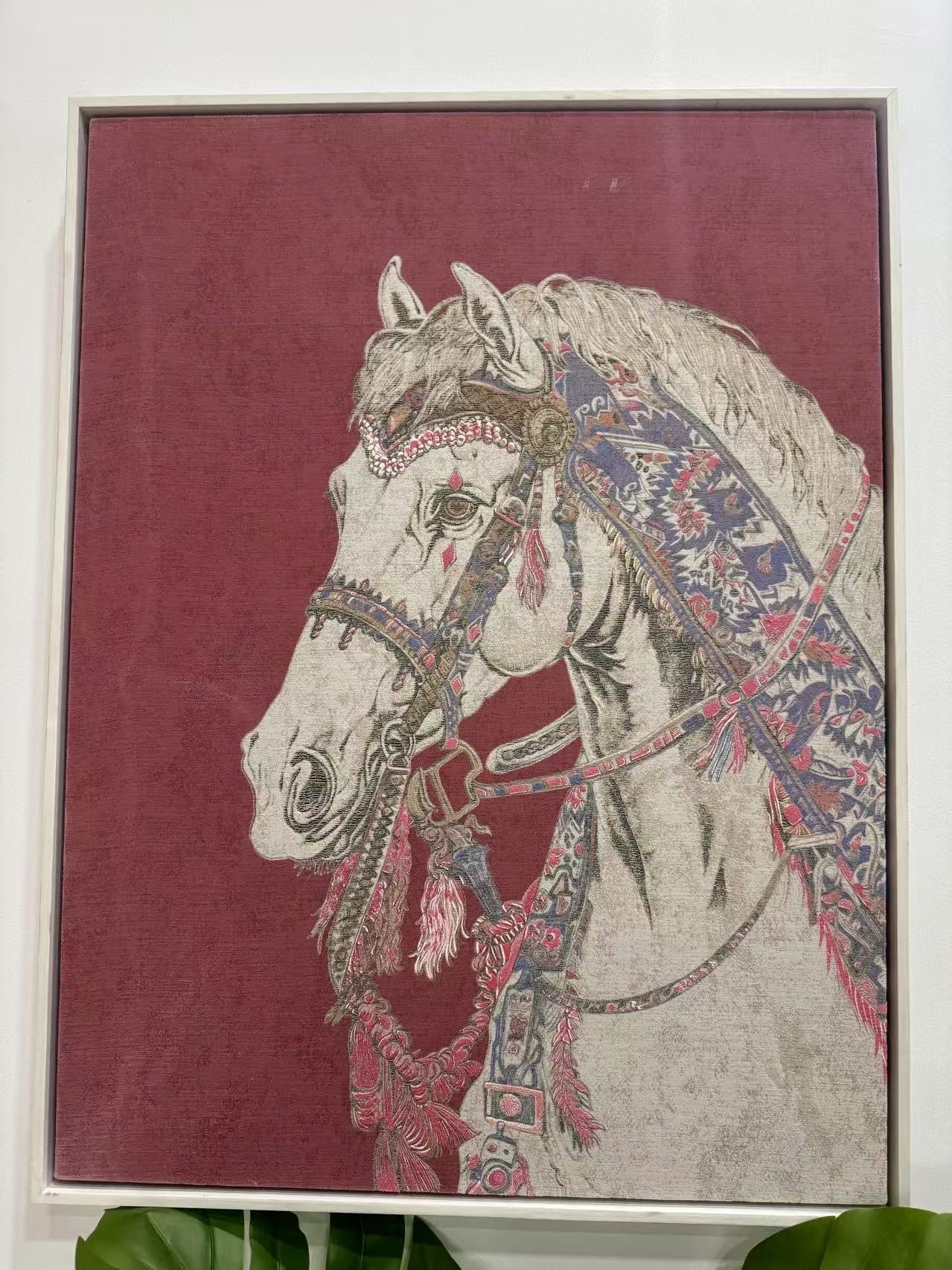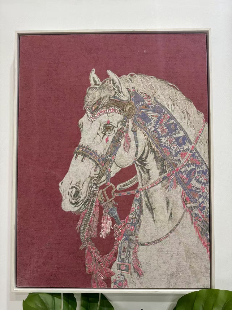 Unique printed canvass same texture as tapestry silk carpets picture depicting beautiful Arabian Horse on a dark ping background with white frame.