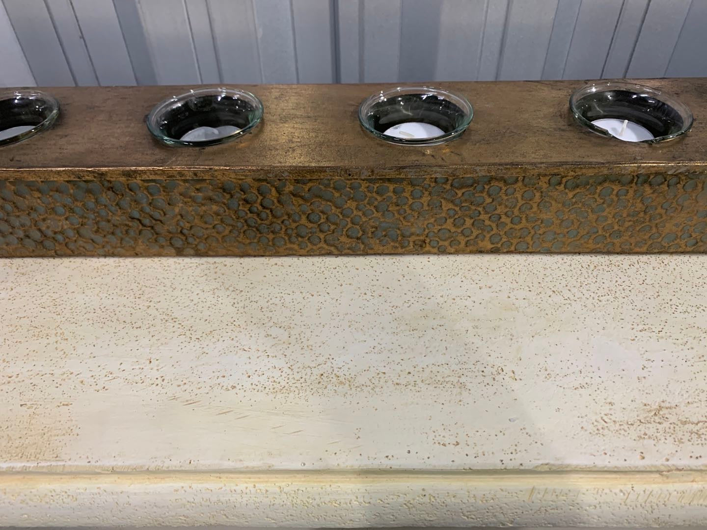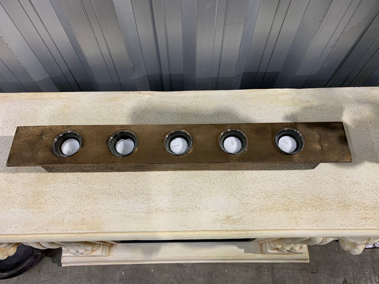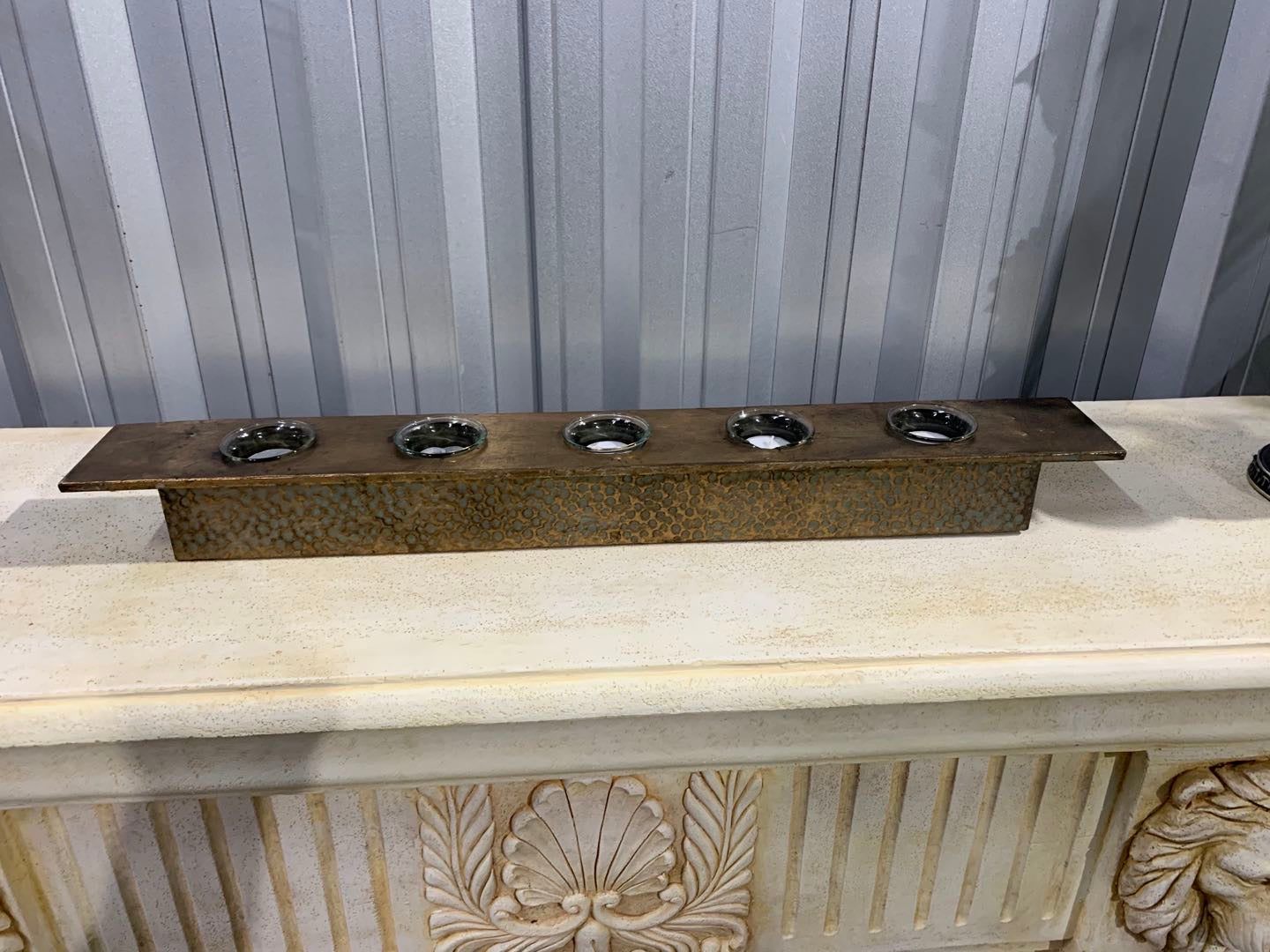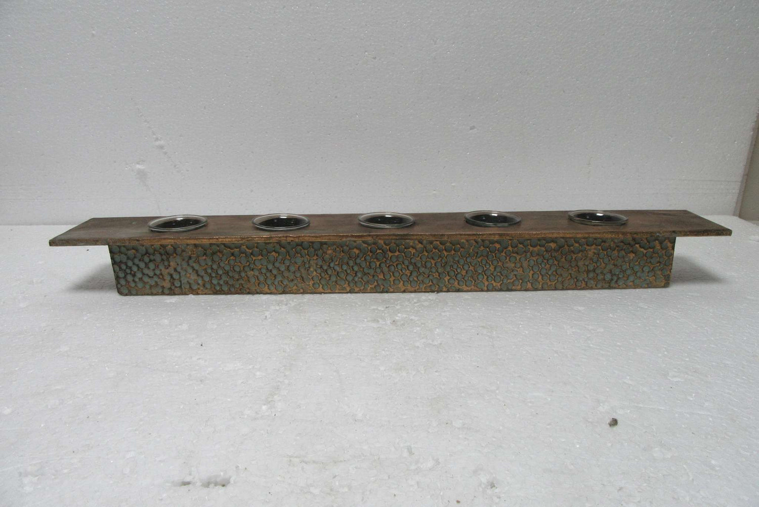 This is a long feature that is table top with hanging 5 glass candle holder inside, including 5 glass holders