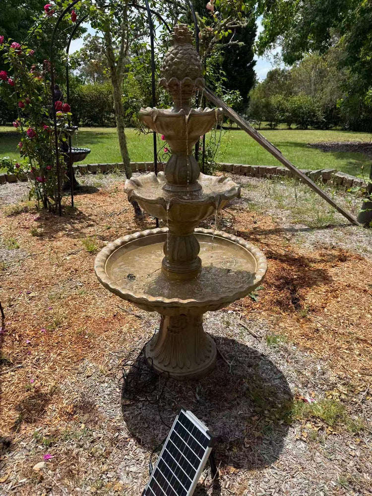 The water circulates from a reservoir hidden inside the feature and is pumped out of the pineapple on the top of the fountain, before gently spilling down through the final tier, ready to be pumped back up to start the cycle all over again.