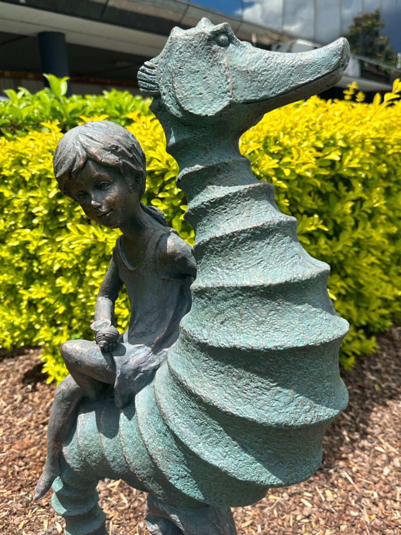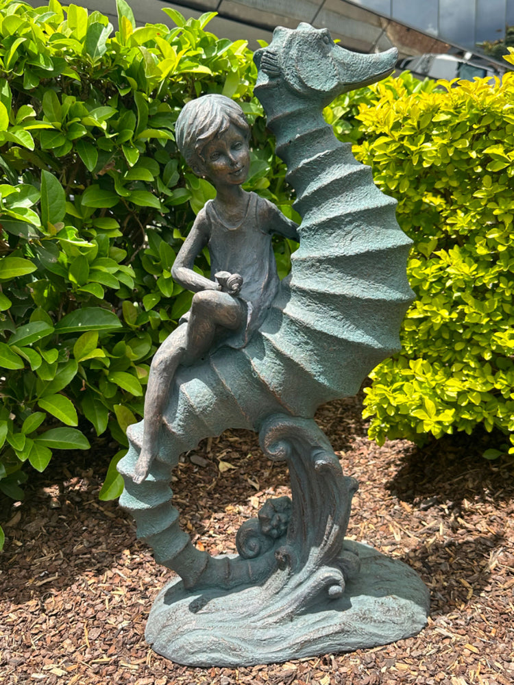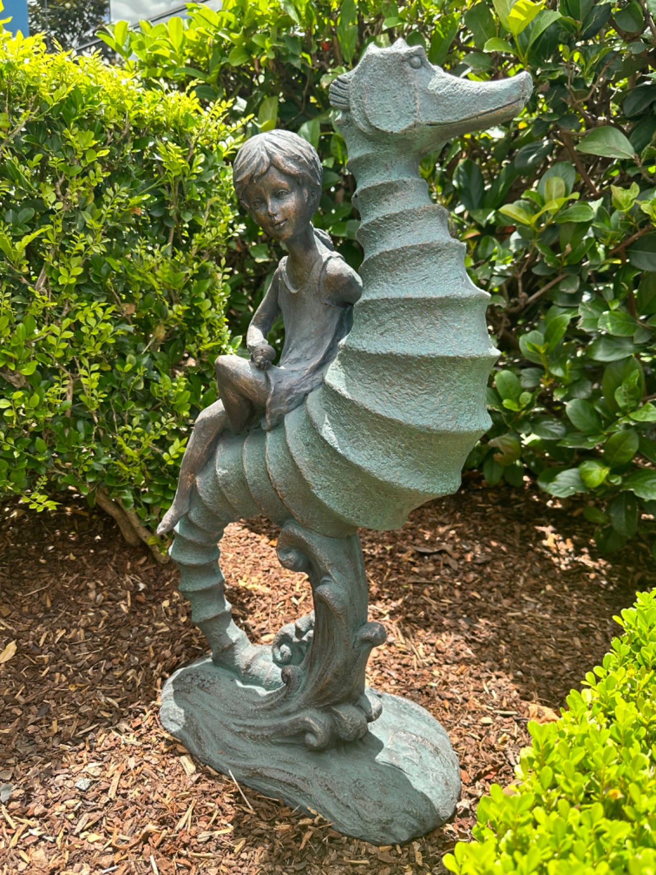 Conquer is a Statue Featuring a brave girl riding a seahorse in the wild, true abstract representation of childhood and innocent imagination.