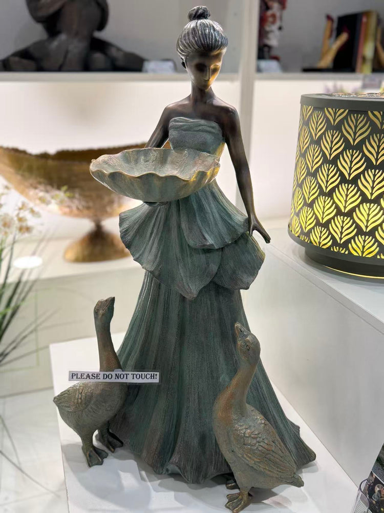 Outstanding elegant feminine lady posing in an intimate reflecting moment. Holding a birdbath in majestic Copper colour with 2 geese.