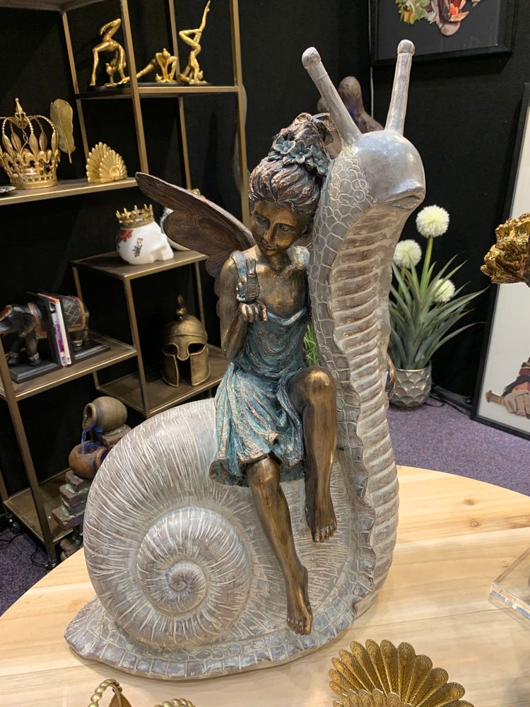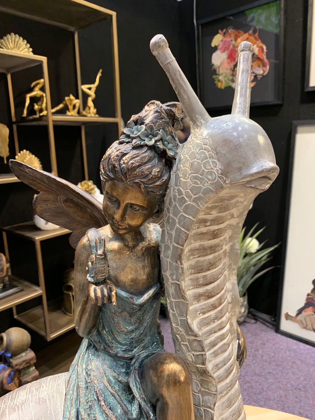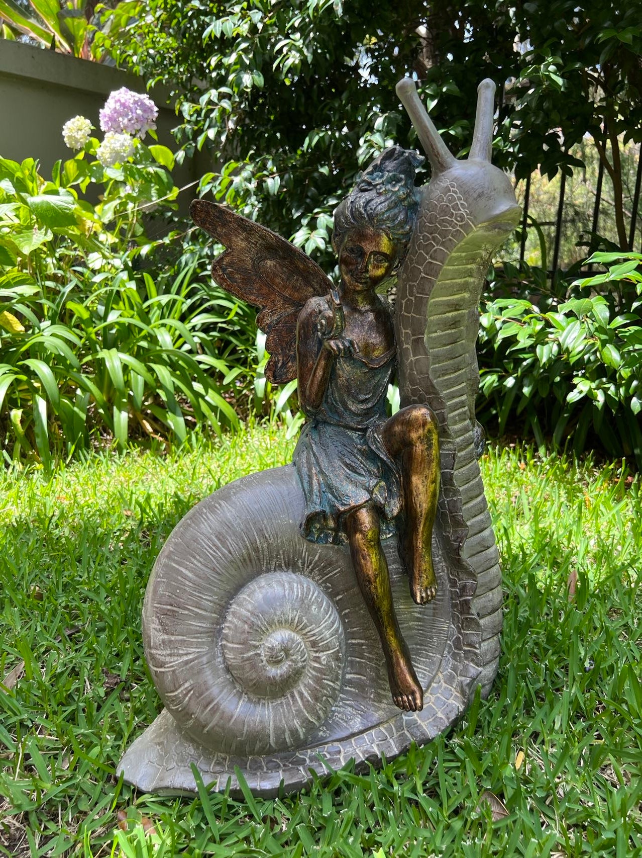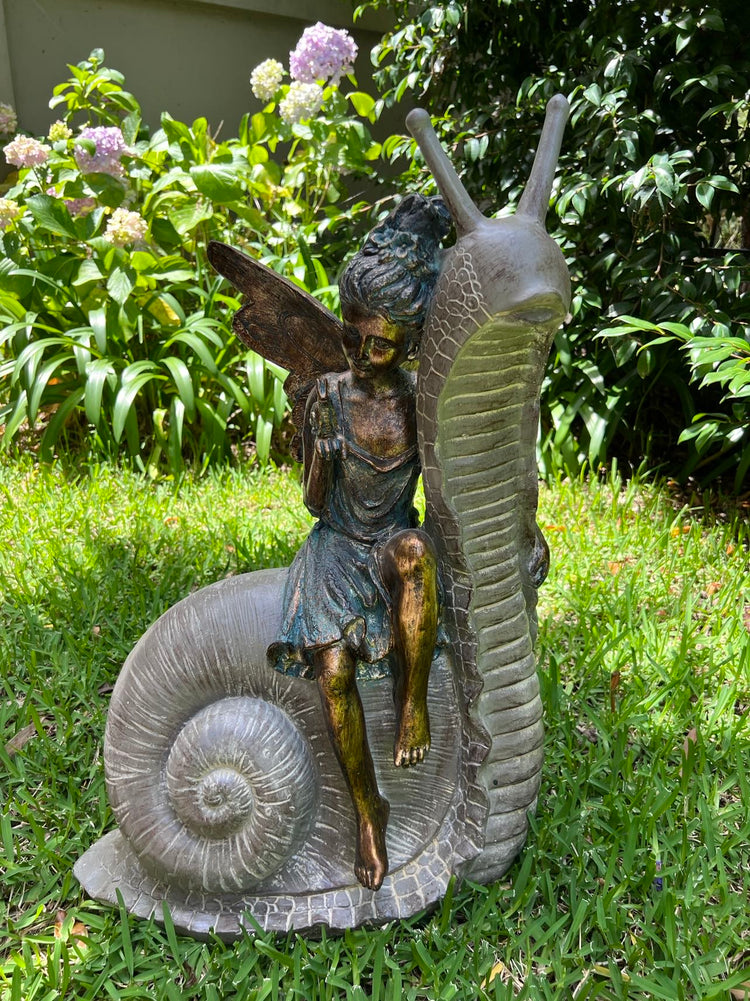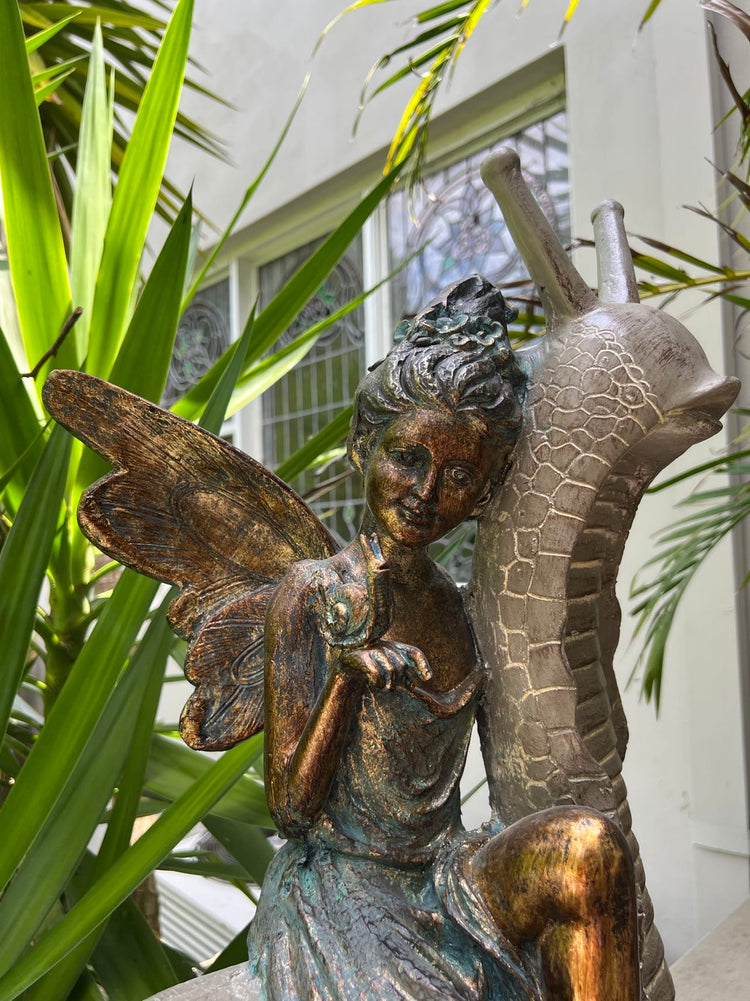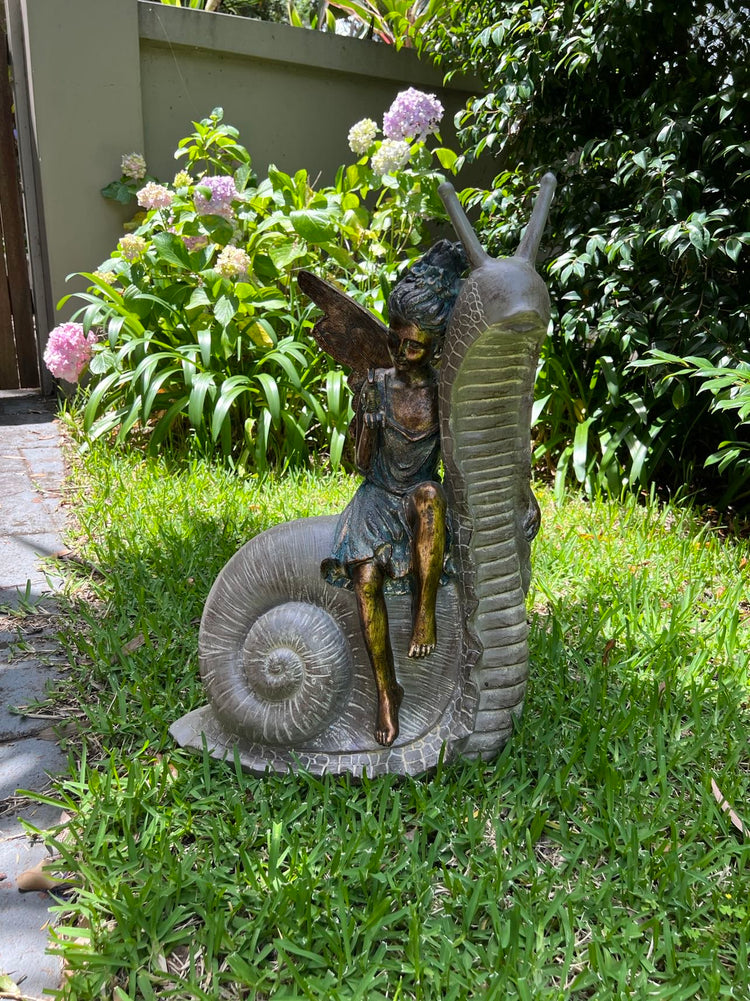 Our new designed fairy on a snail shaped garden ornament with serene beautiful fairy in copper bronze & blue whilst the snail is in natural stone colour.