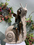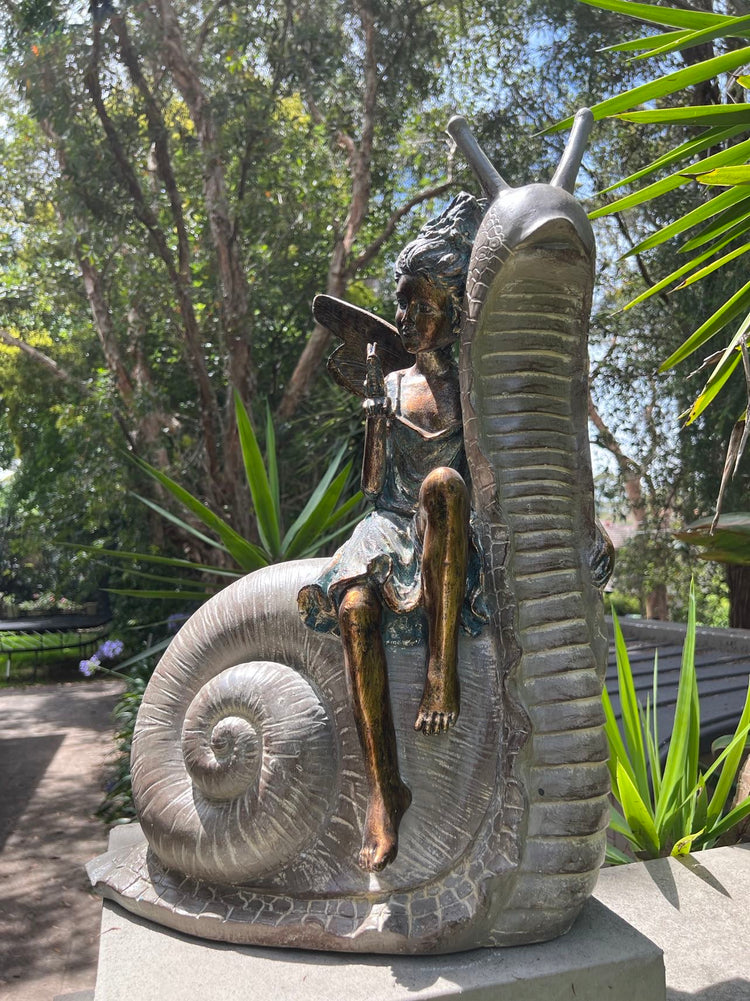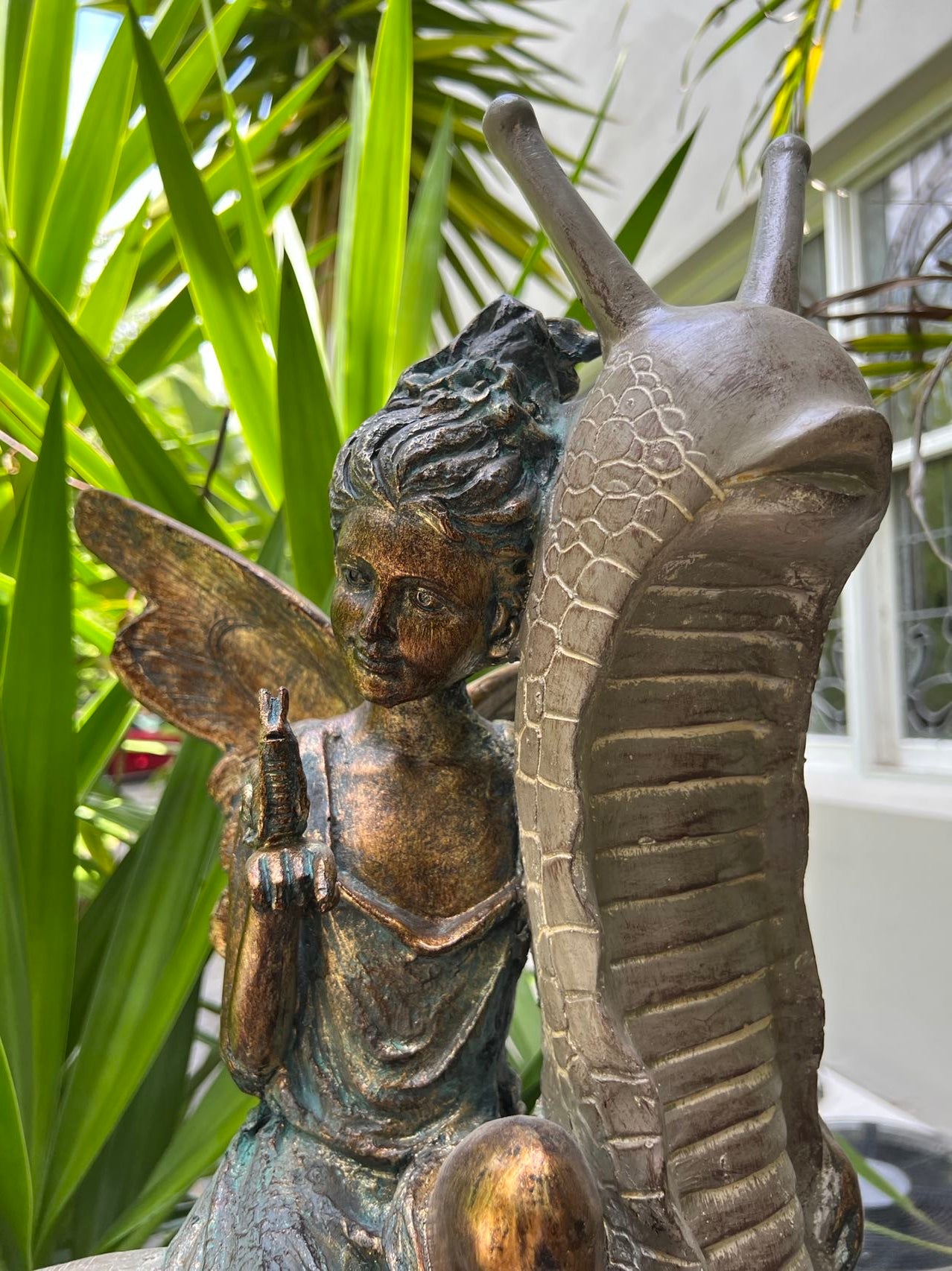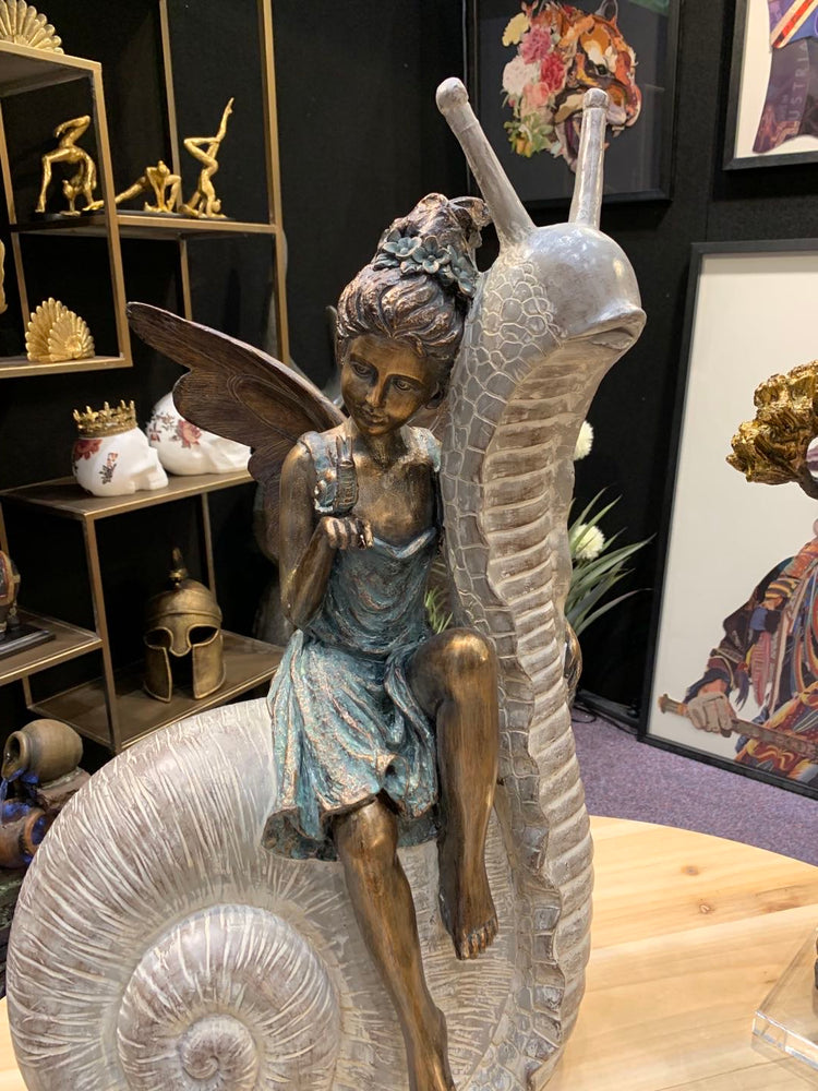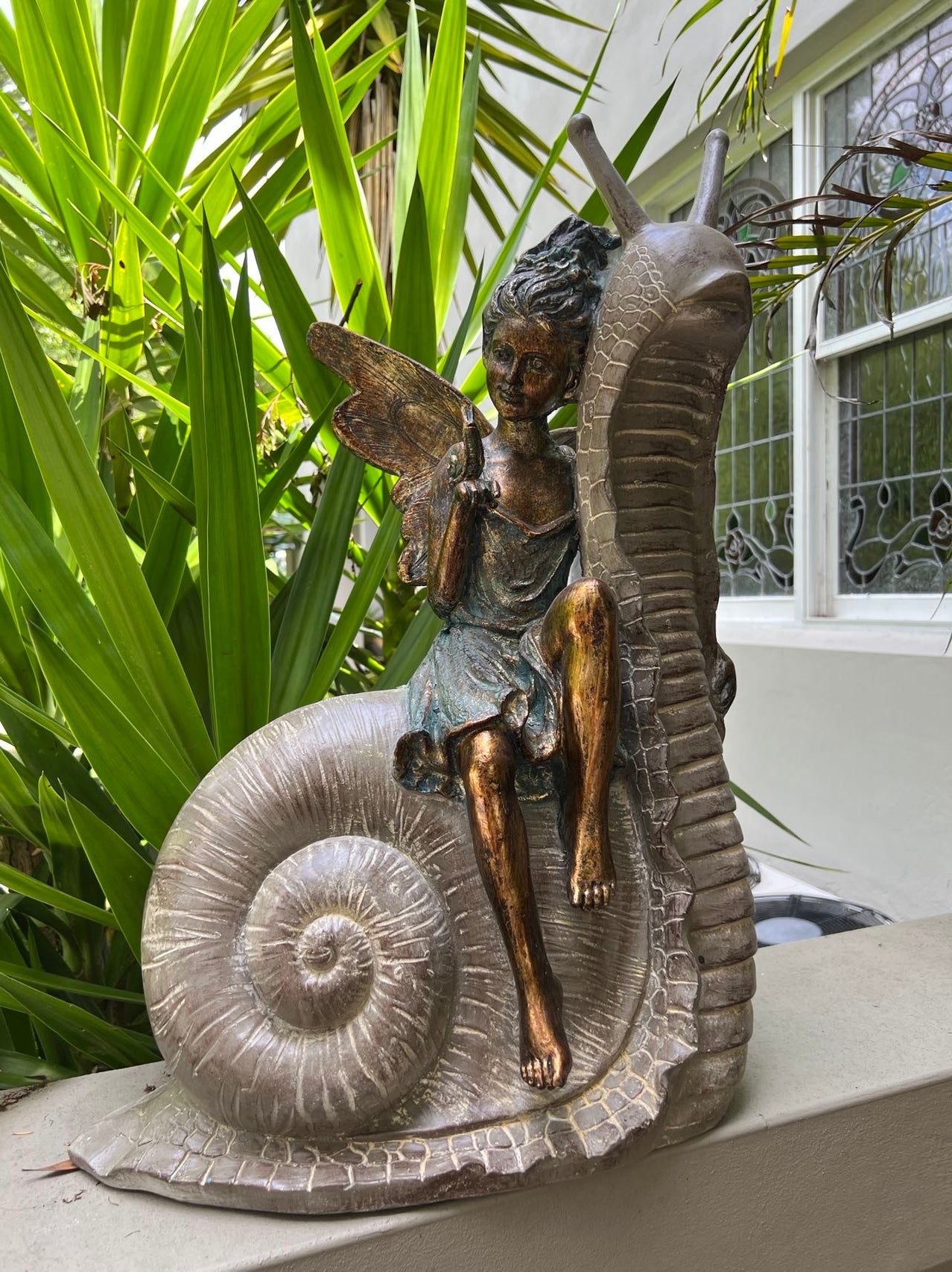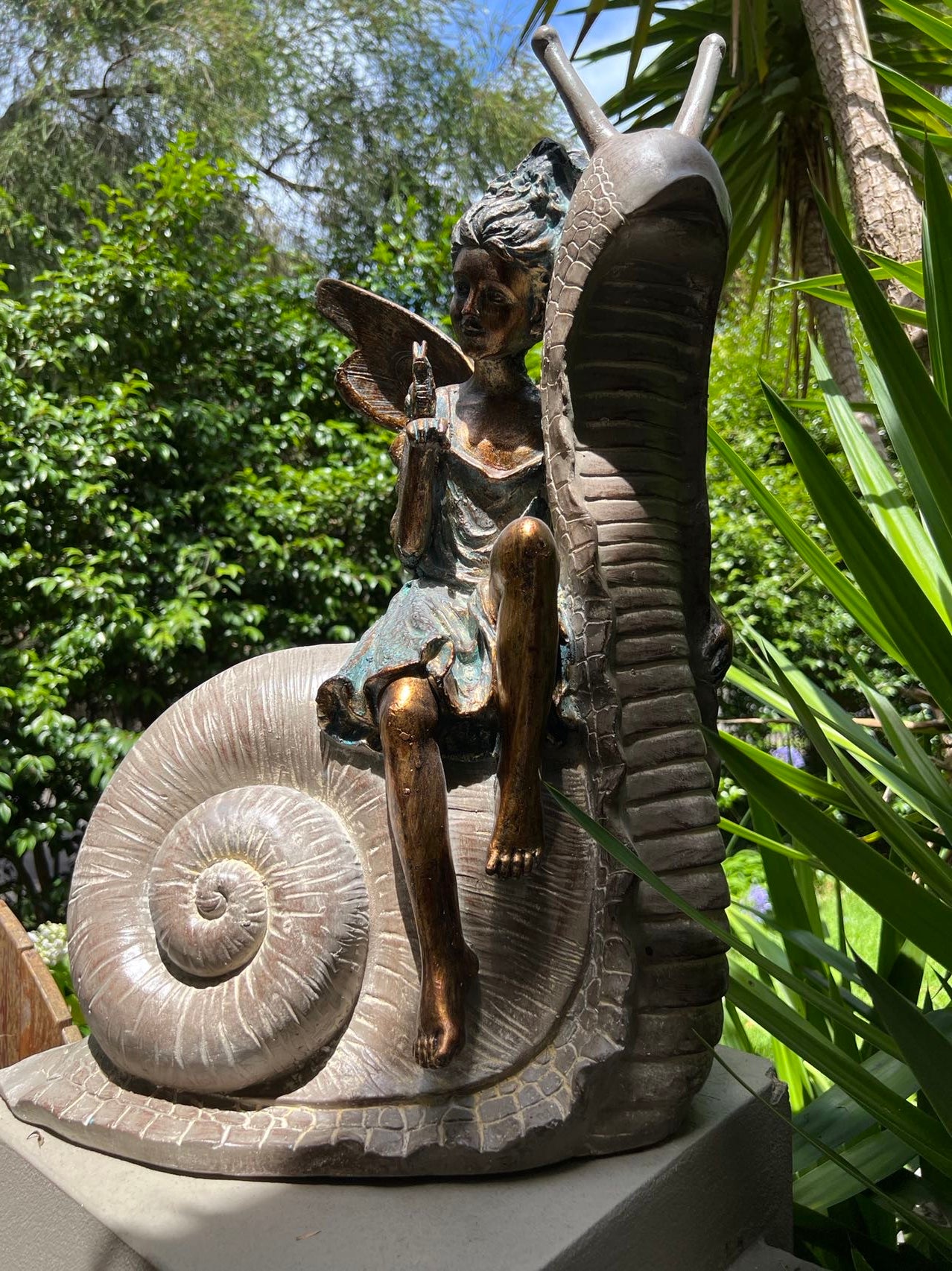 Our new designed fairy on a snail shaped garden ornament with serene beautiful fairy in copper bronze & blue whilst the snail is in natural stone colour.