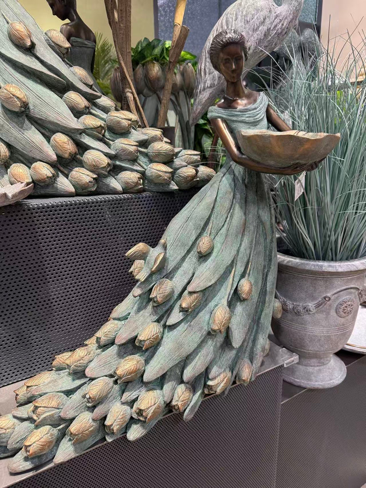 Outstanding elegant feminine lady posing in an intimate reflecting moment. Holding a birdbath in majestic Copper colour.