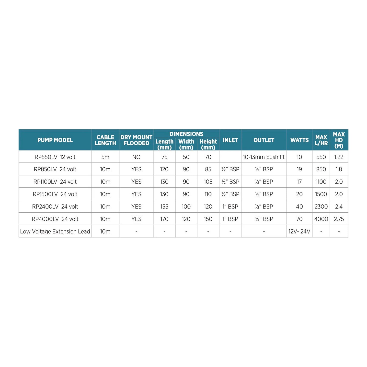 The RP1500LV is a low voltage 24V Pump. This pump has numerous applications for aquariums, garden fountains, table and wall fountains and hydroponics.