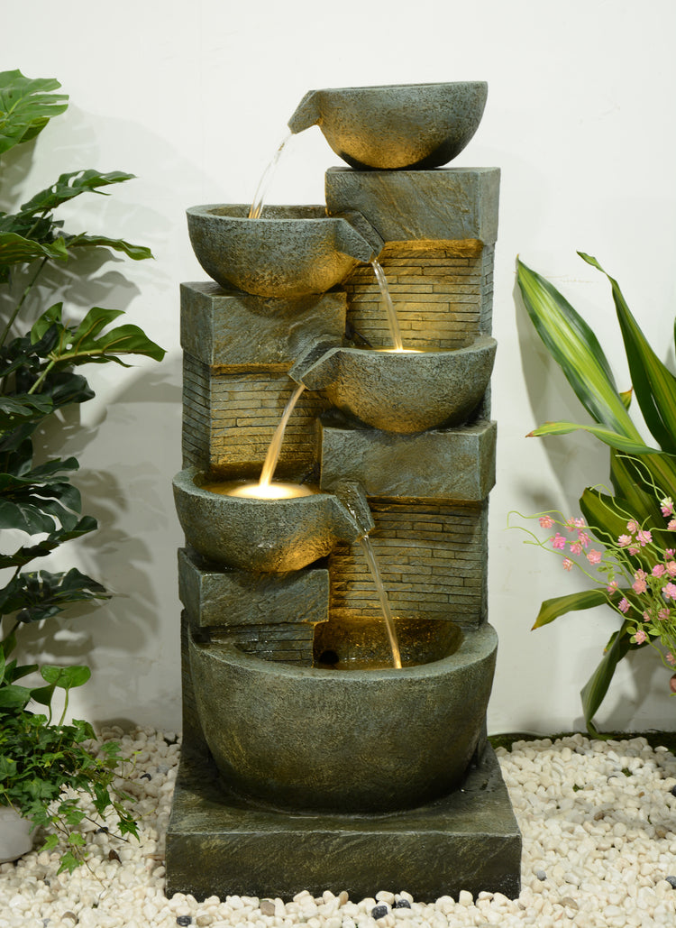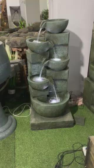 This is a premium designer quality fountain suitable for indoor & outdoor locations. The design combines traditional & contemporary concepts. This is truly an amazing water feature producing amazing visual effects with water & lights as well as genuine water sounds from the 5 levels and 4 drops.