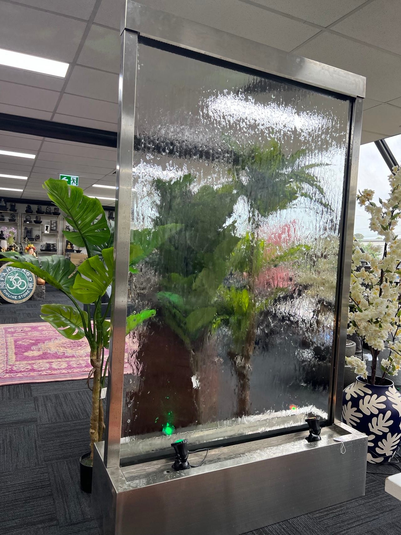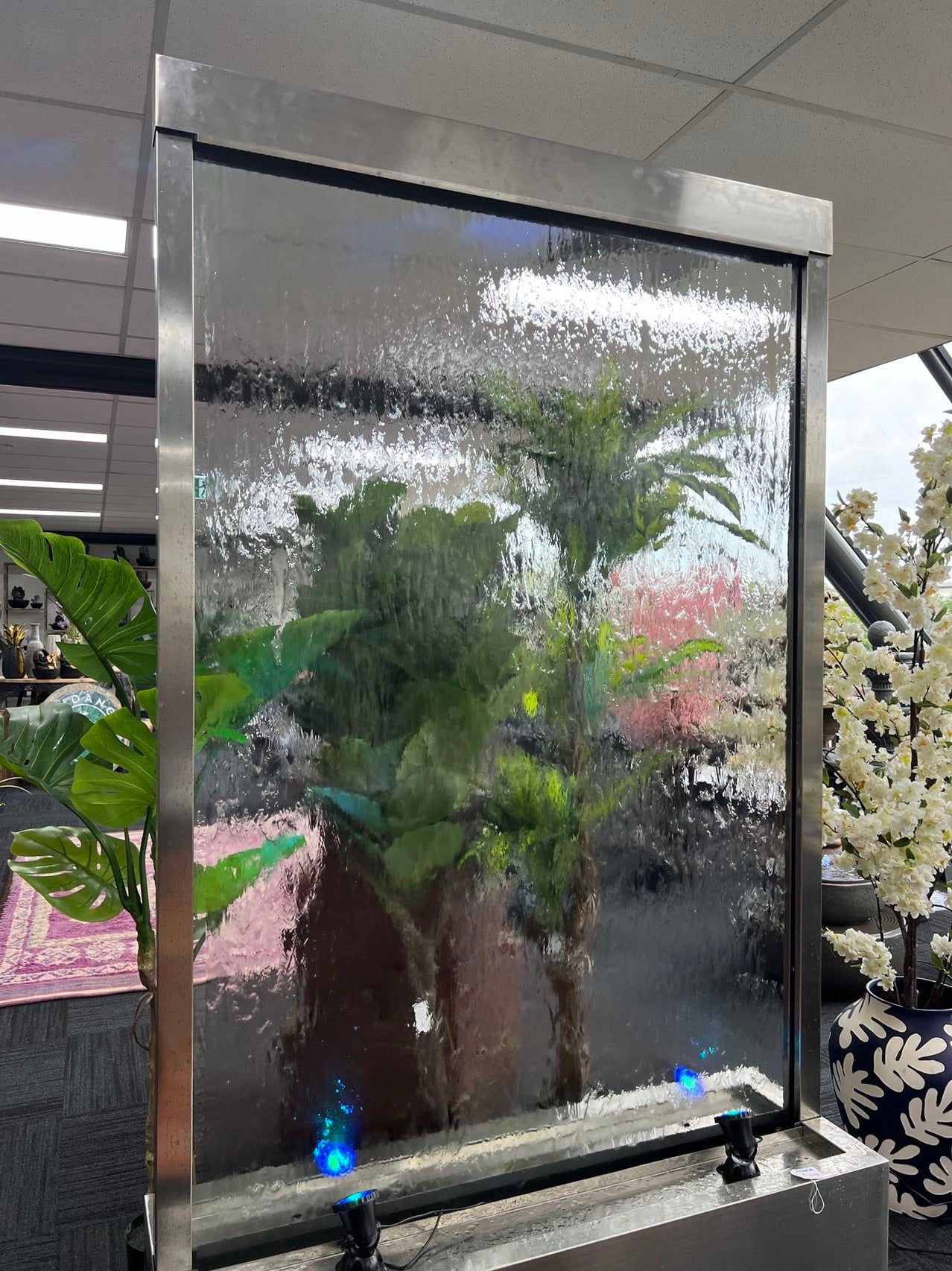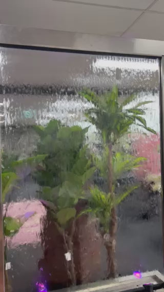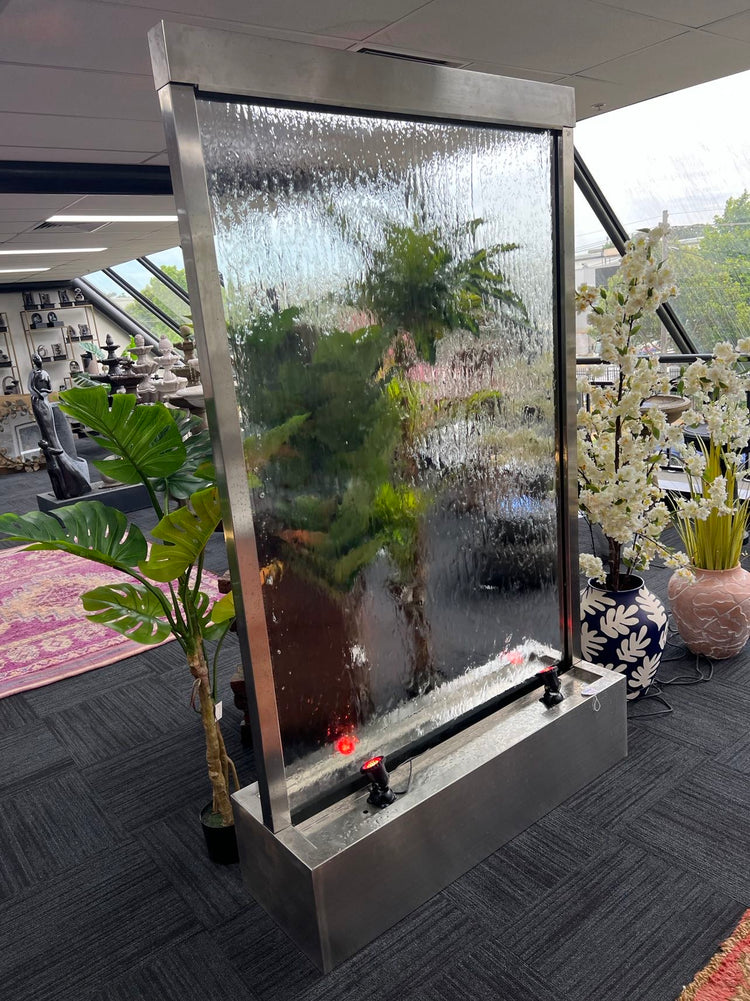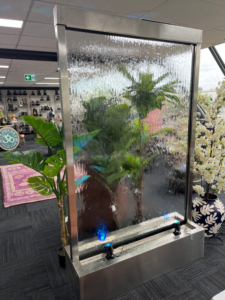 Exceptional 2 Meter Tall Water Wall made of Stainless Steel Frame & Base with Clear Glass or Mirror Back Panel. Amazing Water Feature to be used as a space divider, room divider, office / trade & brand advertising and to portray brand personality and space charm.