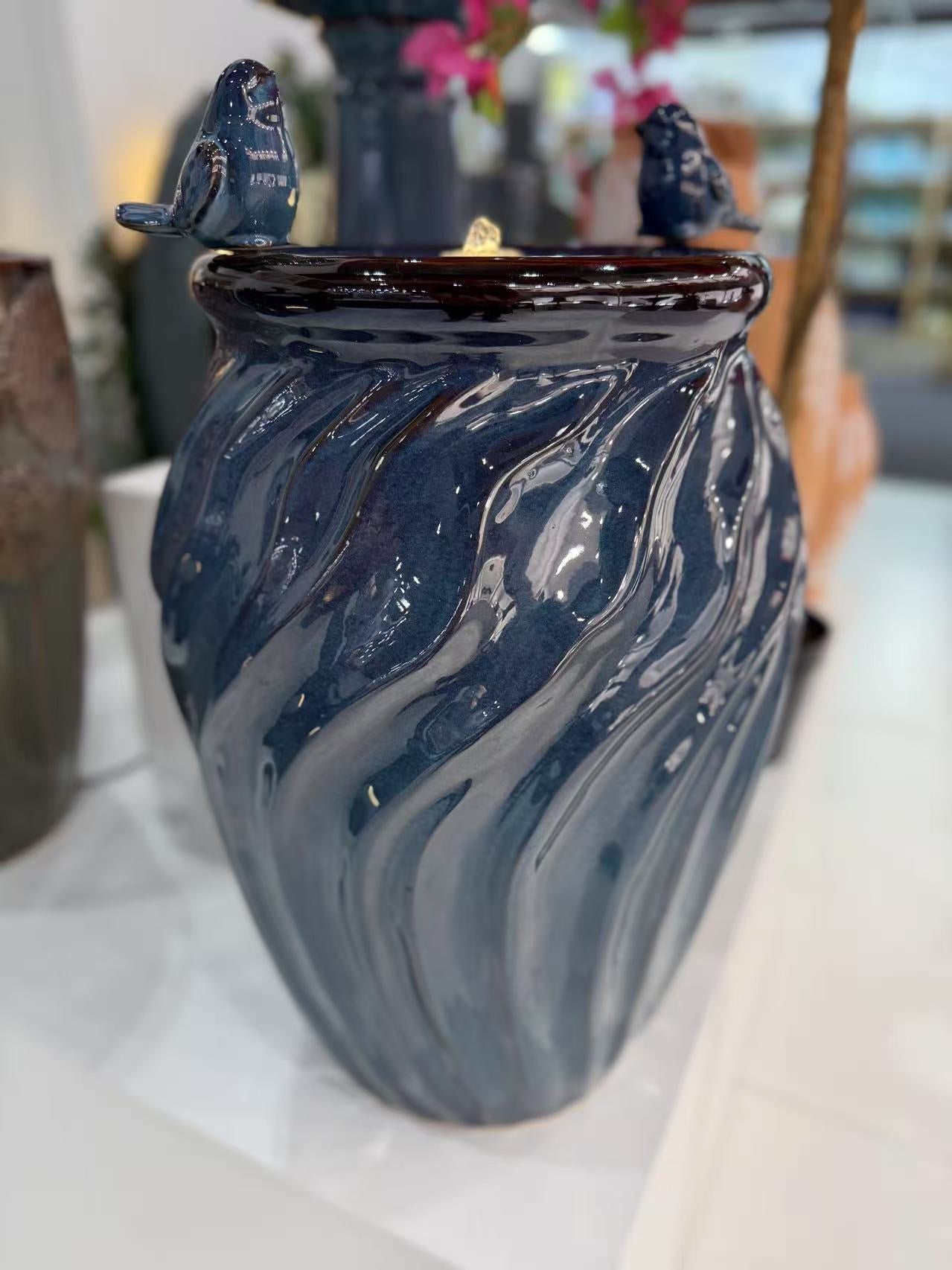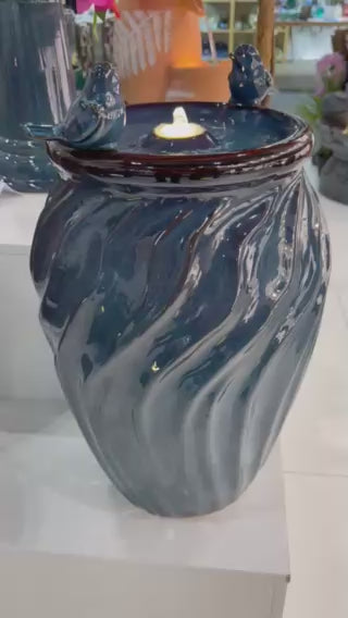 Isleta Glazed Ceramic Urn Shaped Blue Fountain with Birds