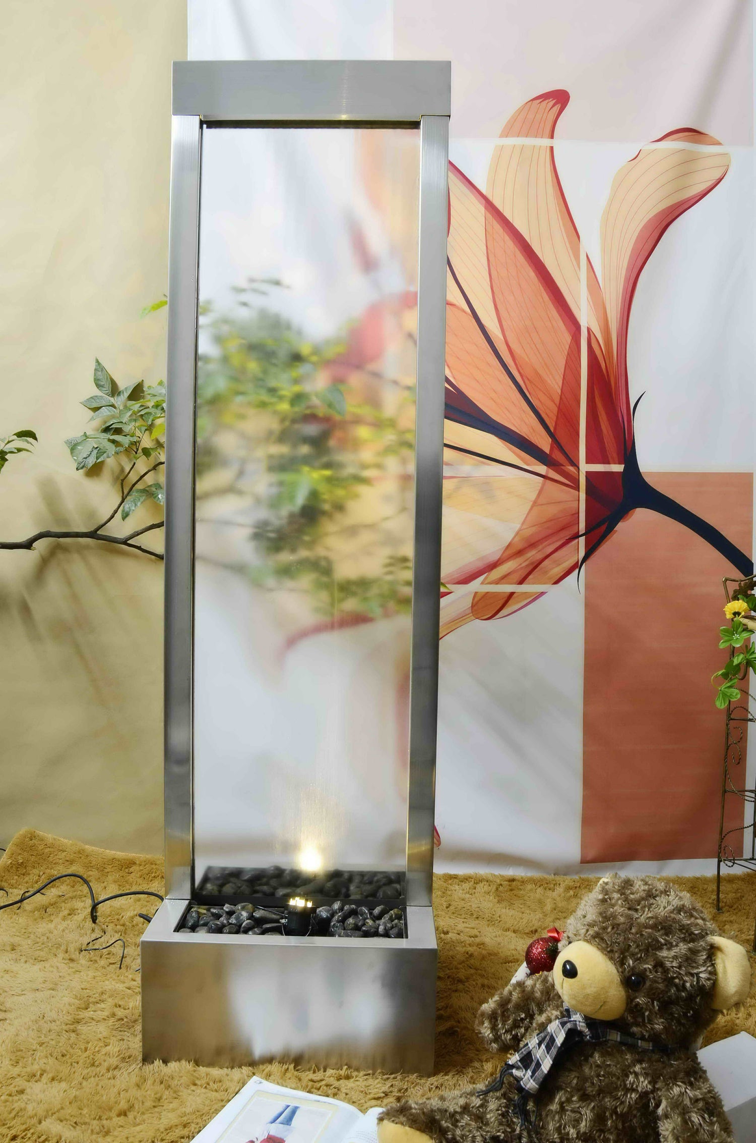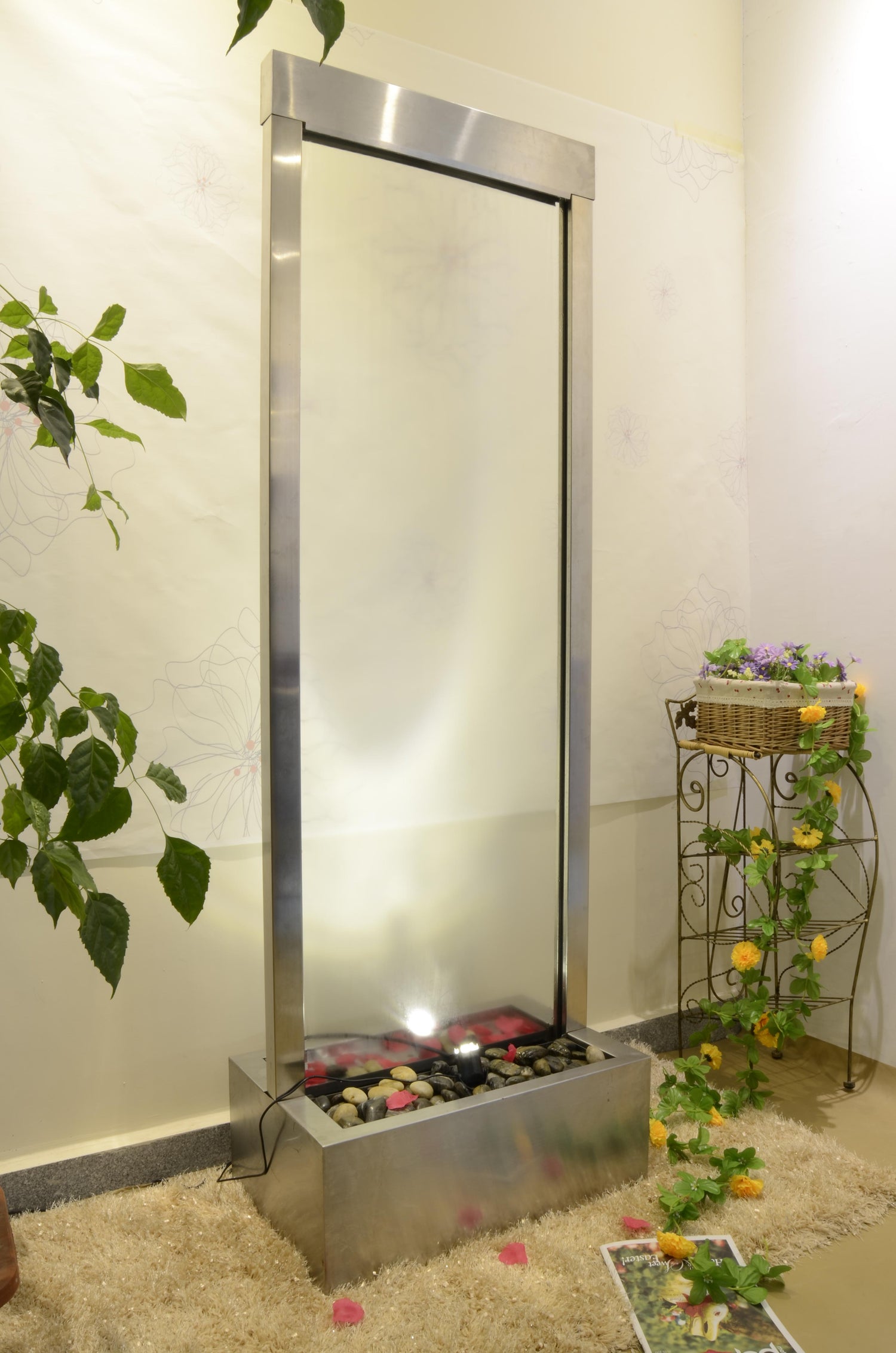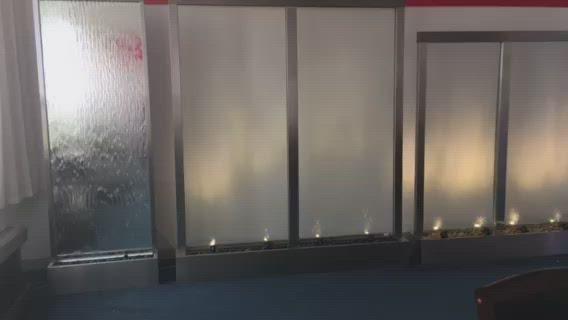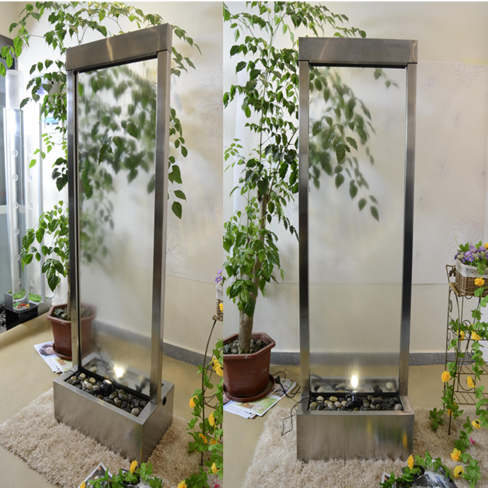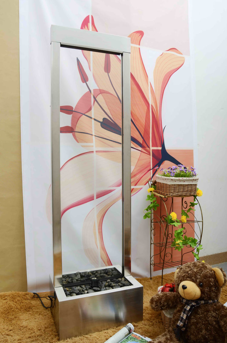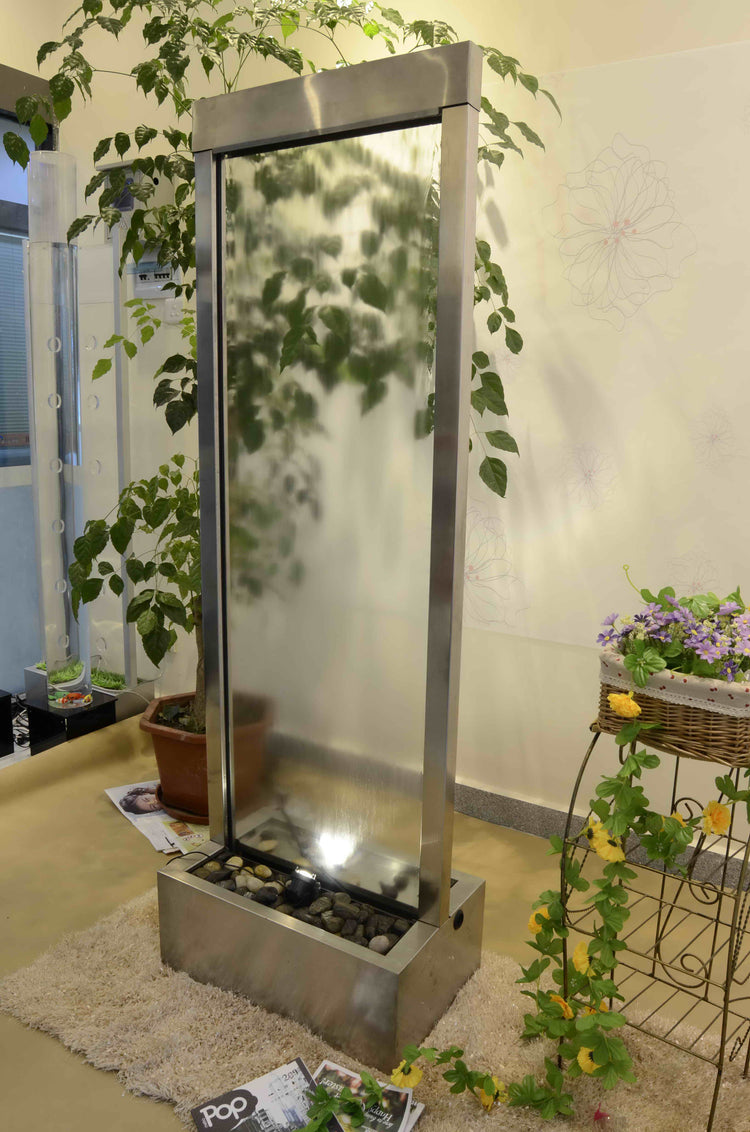 1.83meter Tall Waterfall has a centre mounted clear glass panel, viewable from both sides ideal for outdoor or large indoor areas, the basin can be buried into the ground to create a natural effect that the water is flowing along the natural settings & landscape.