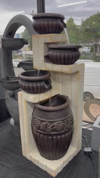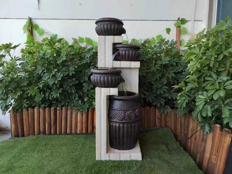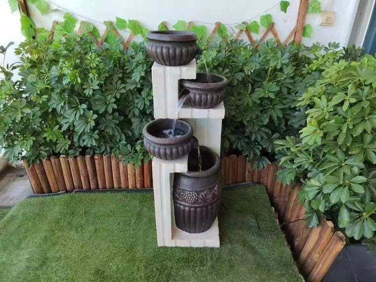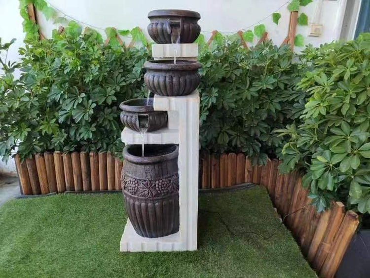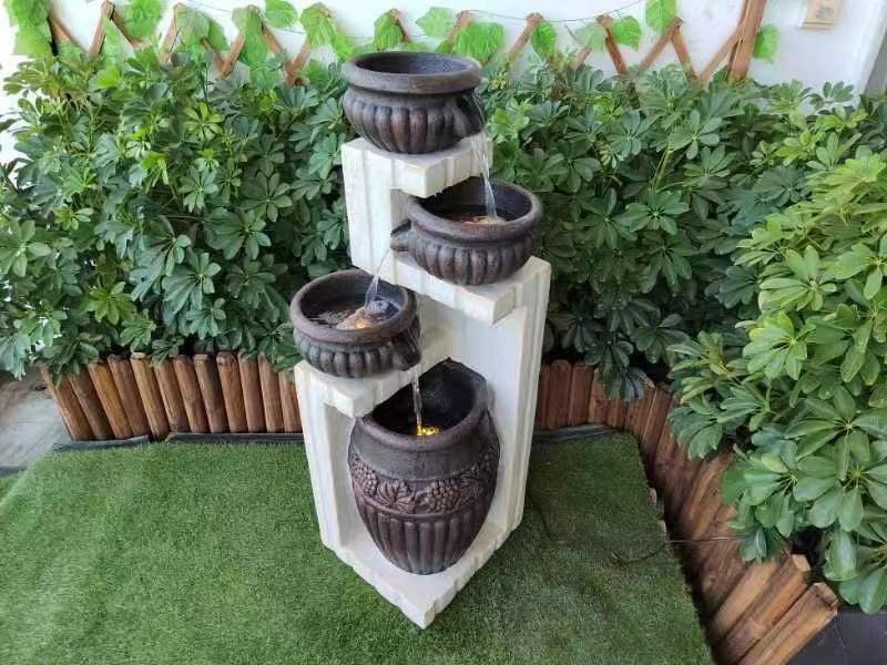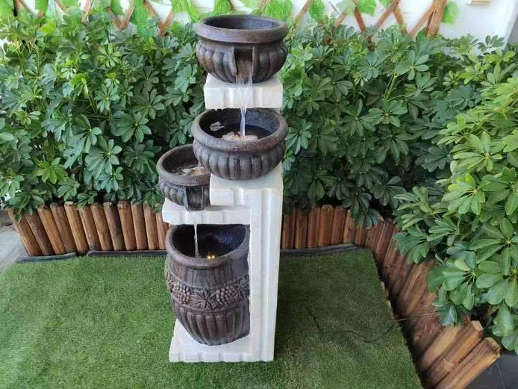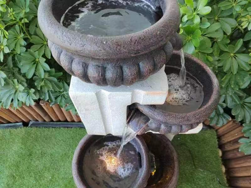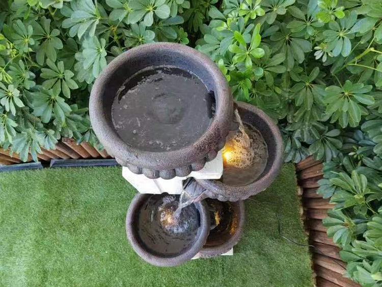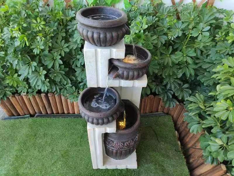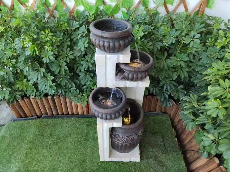 This is a premium designer quality fountain suitable for indoor & outdoor locations. The design combines traditional & contemporary concepts. This is truly an amazing water feature producing amazing visual effects with water & lights as well as genuine water sounds from the 4 levels and 3 drops.