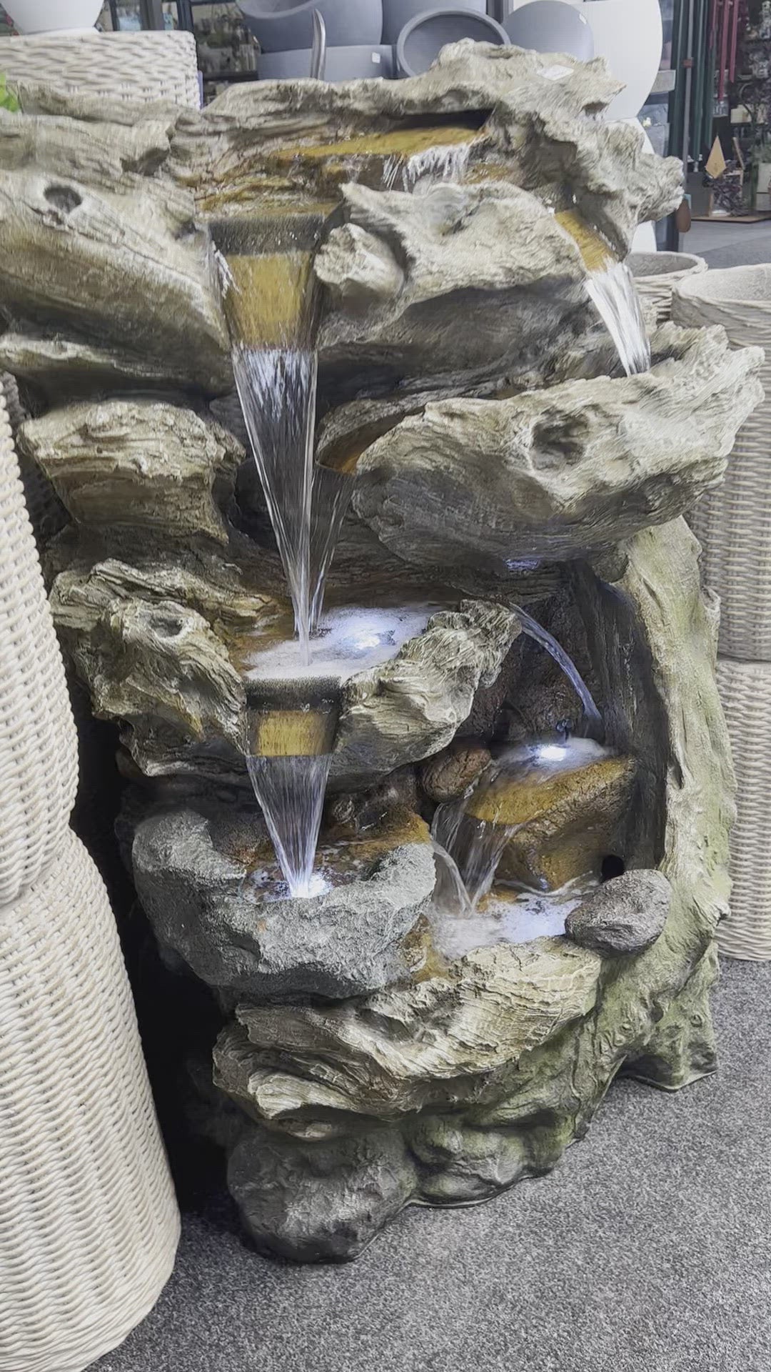 This striking water feature has been constructed from polyresin for extra durability and a longer lifetime. This innovative material can be beautifully moulded and finished to resemble real wood while being lighter and more durable, making it easier to position in your garden. . It has also been UV balanced to help prevent discolouration and deterioration in strong sunlight.