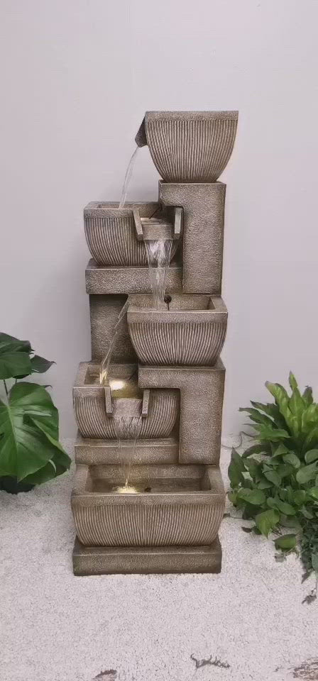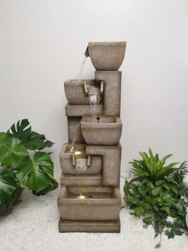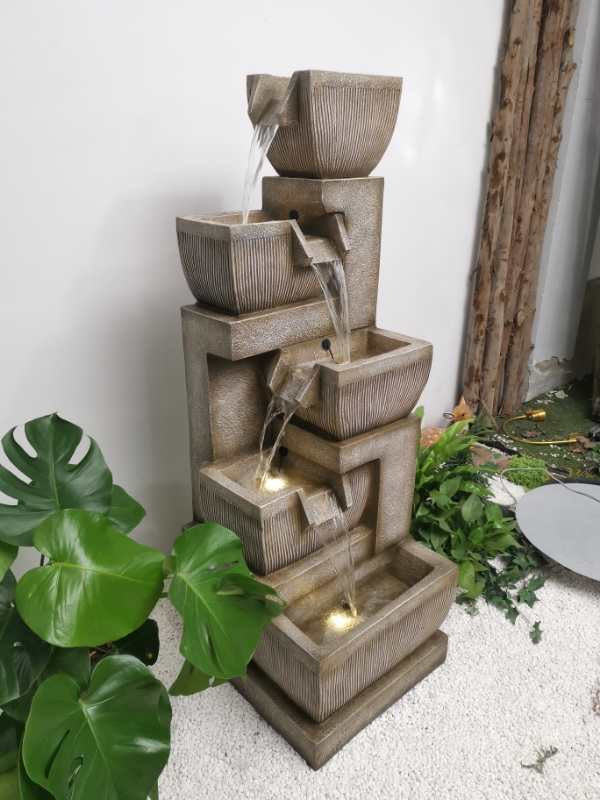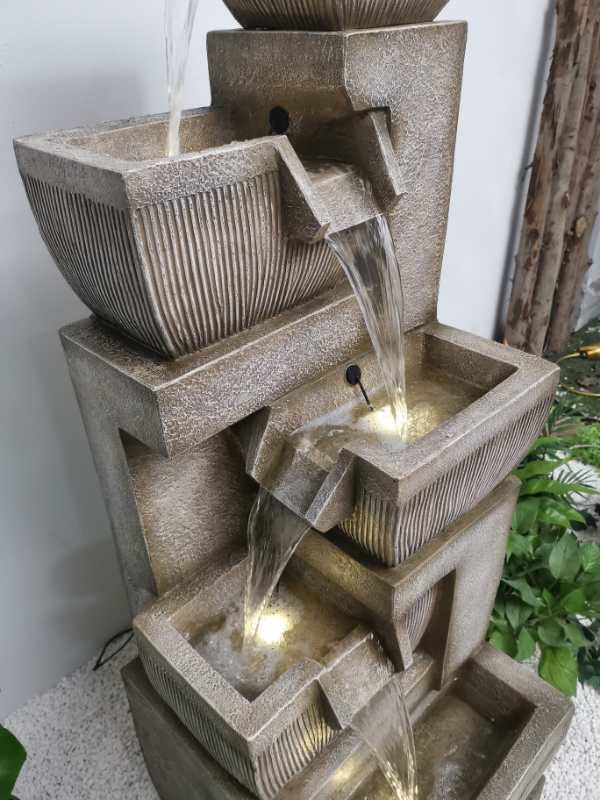 This is a premium designer quality fountain suitable for indoor & outdoor locations. The design combines traditional & contemporary concepts. This is truly an amazing water feature producing amazing visual effects with water & lights as well as genuine water sounds from the 5 levels and 4 drops.
