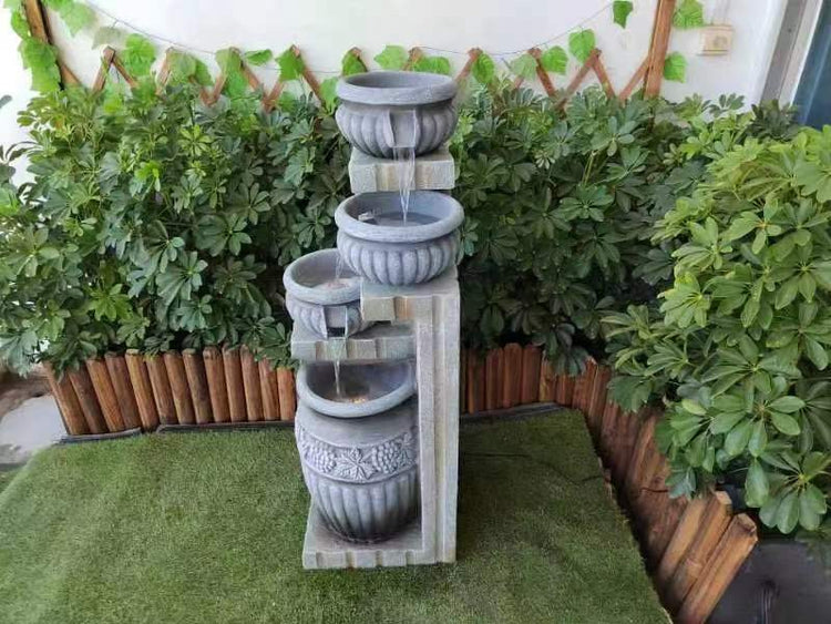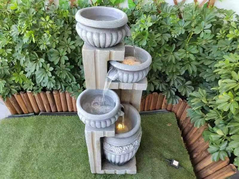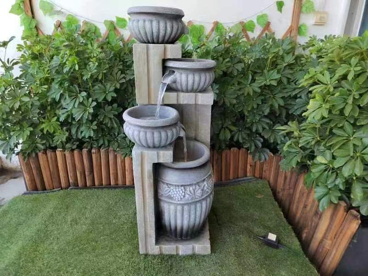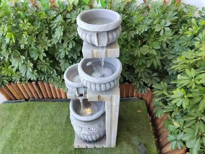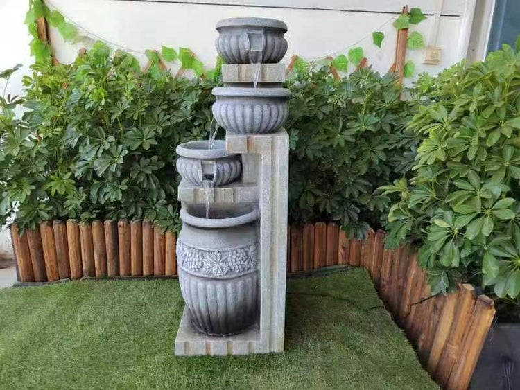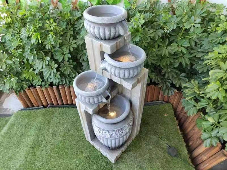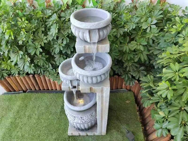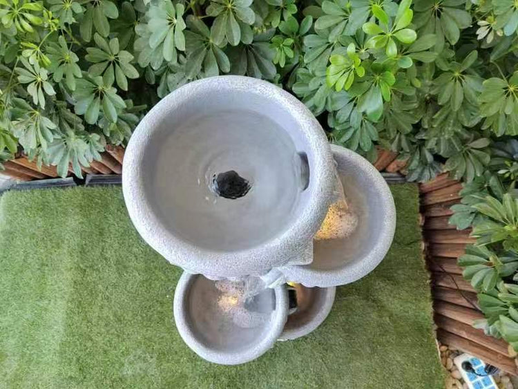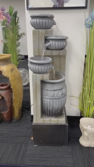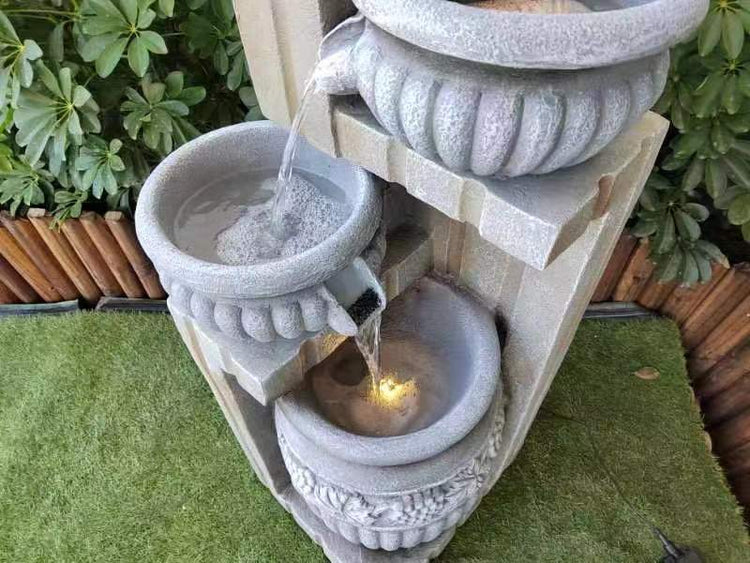 This is a premium designer quality fountain suitable for indoor & outdoor locations. The design combines traditional & contemporary concepts. This is truly an amazing water feature producing amazing visual effects with water & lights as well as genuine water sounds from the 4 levels and 3 drops.