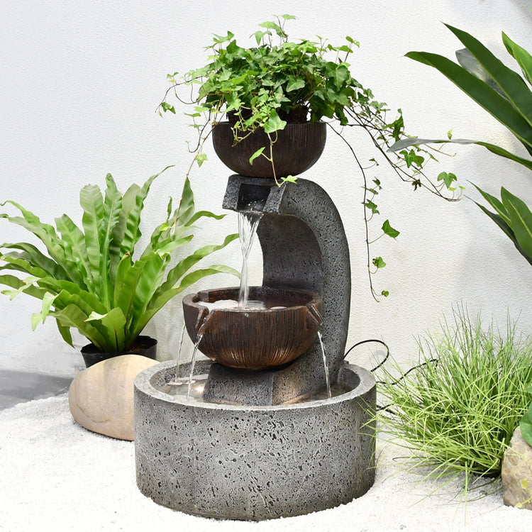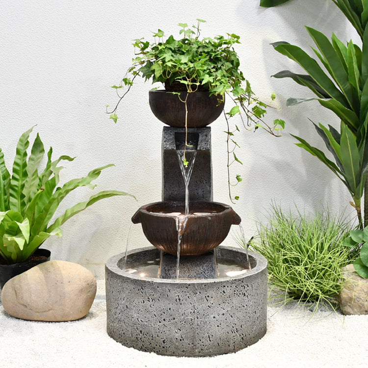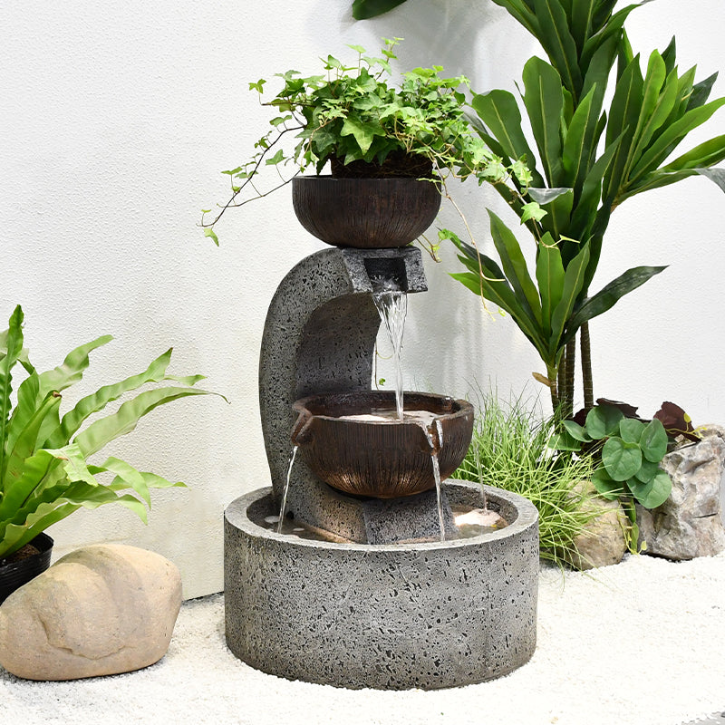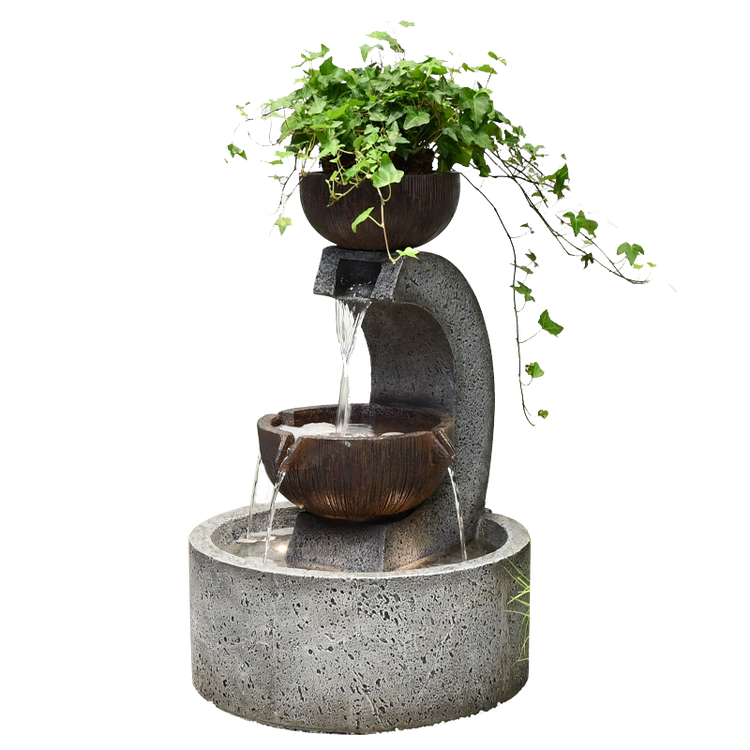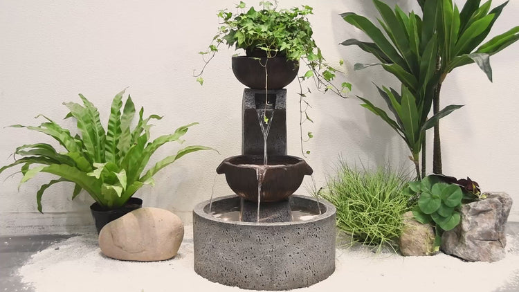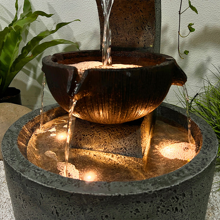 This is a premium designer quality fountain suitable for indoor & outdoor locations. The design combines traditional & contemporary concepts. This is truly an amazing water feature producing amazing visual effects with water & lights as well as genuine water sounds from the 4 levels and 3 drops.