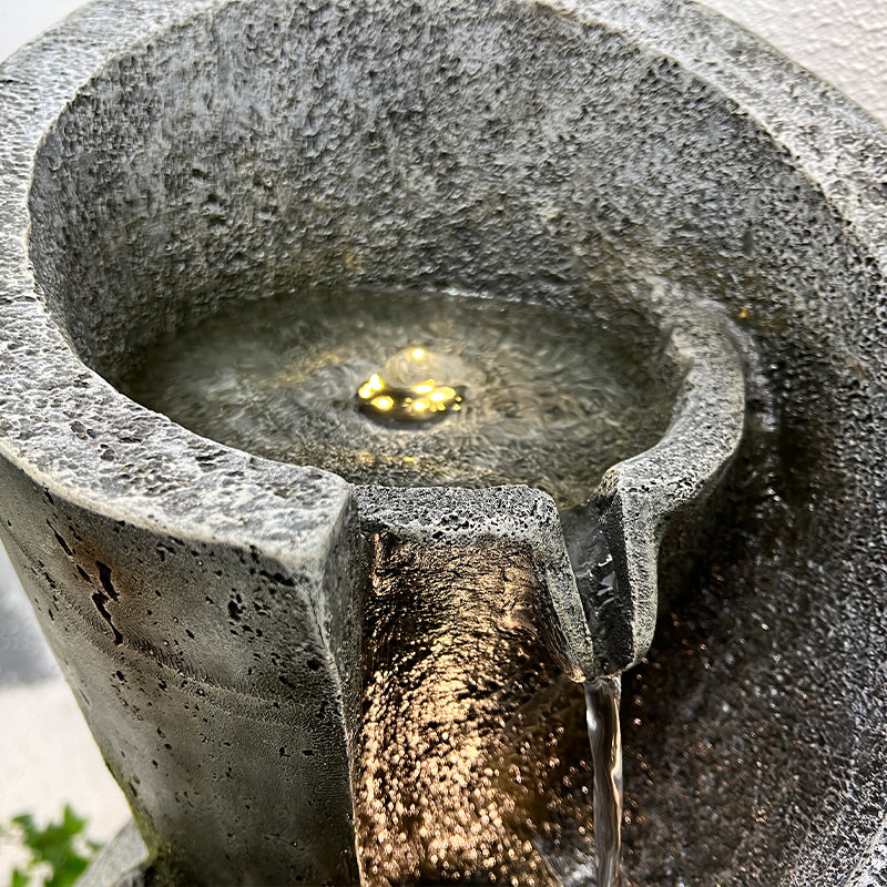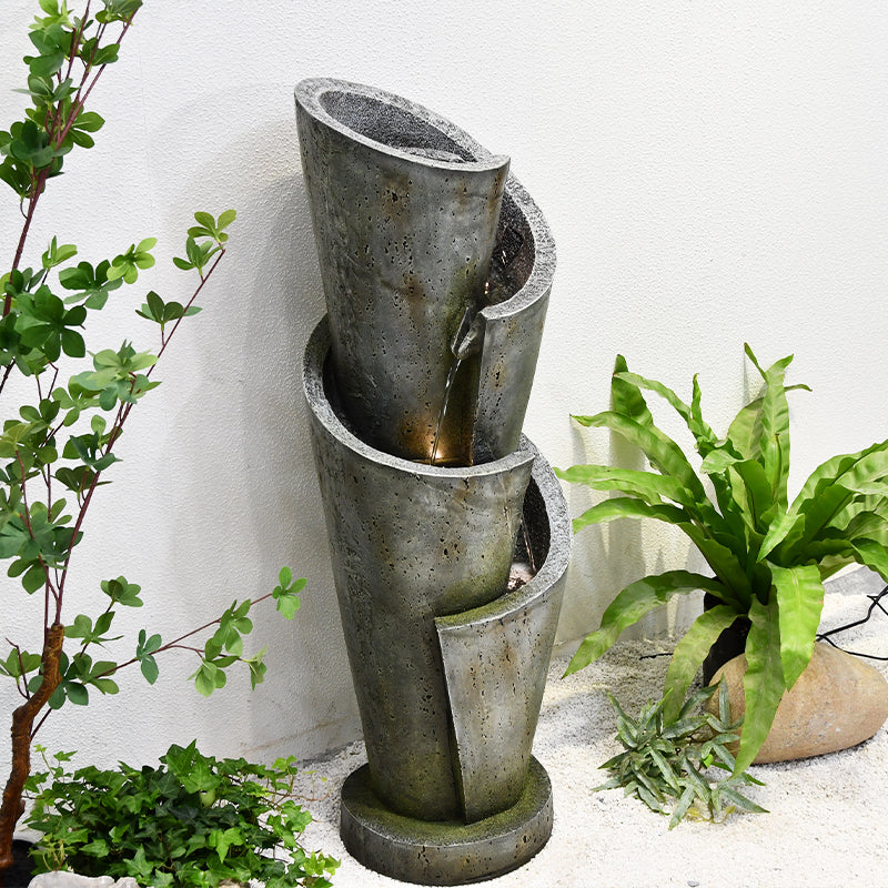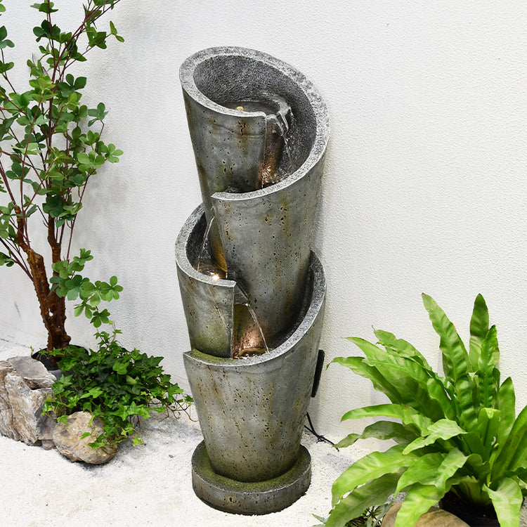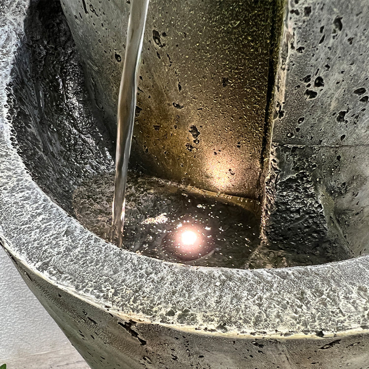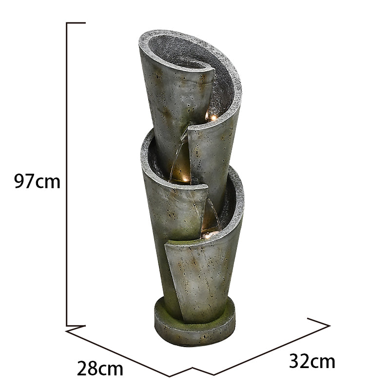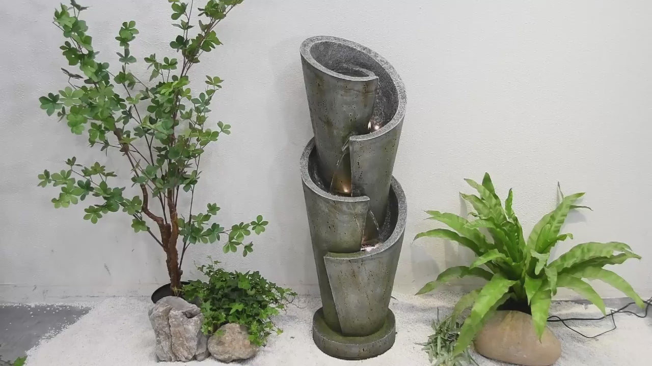 This is a premium designer quality fountain suitable for indoor & outdoor locations. The design combines traditional & contemporary concepts. This is truly an amazing water feature producing amazing visual effects with water & lights as well as genuine water sounds from the 4 levels and 3 drops.