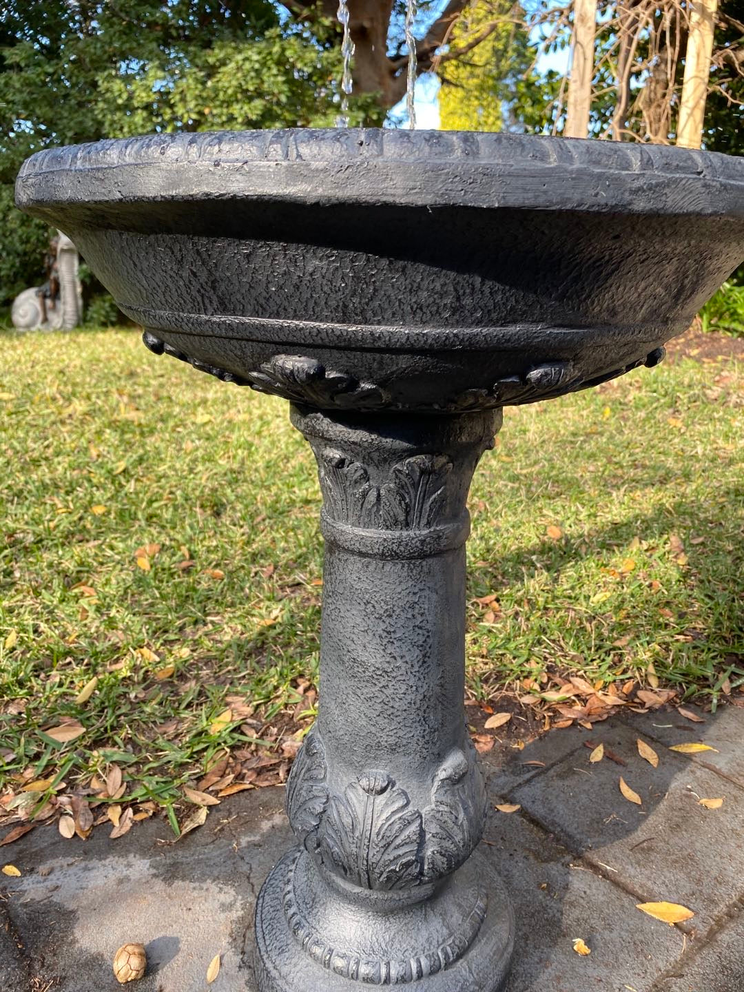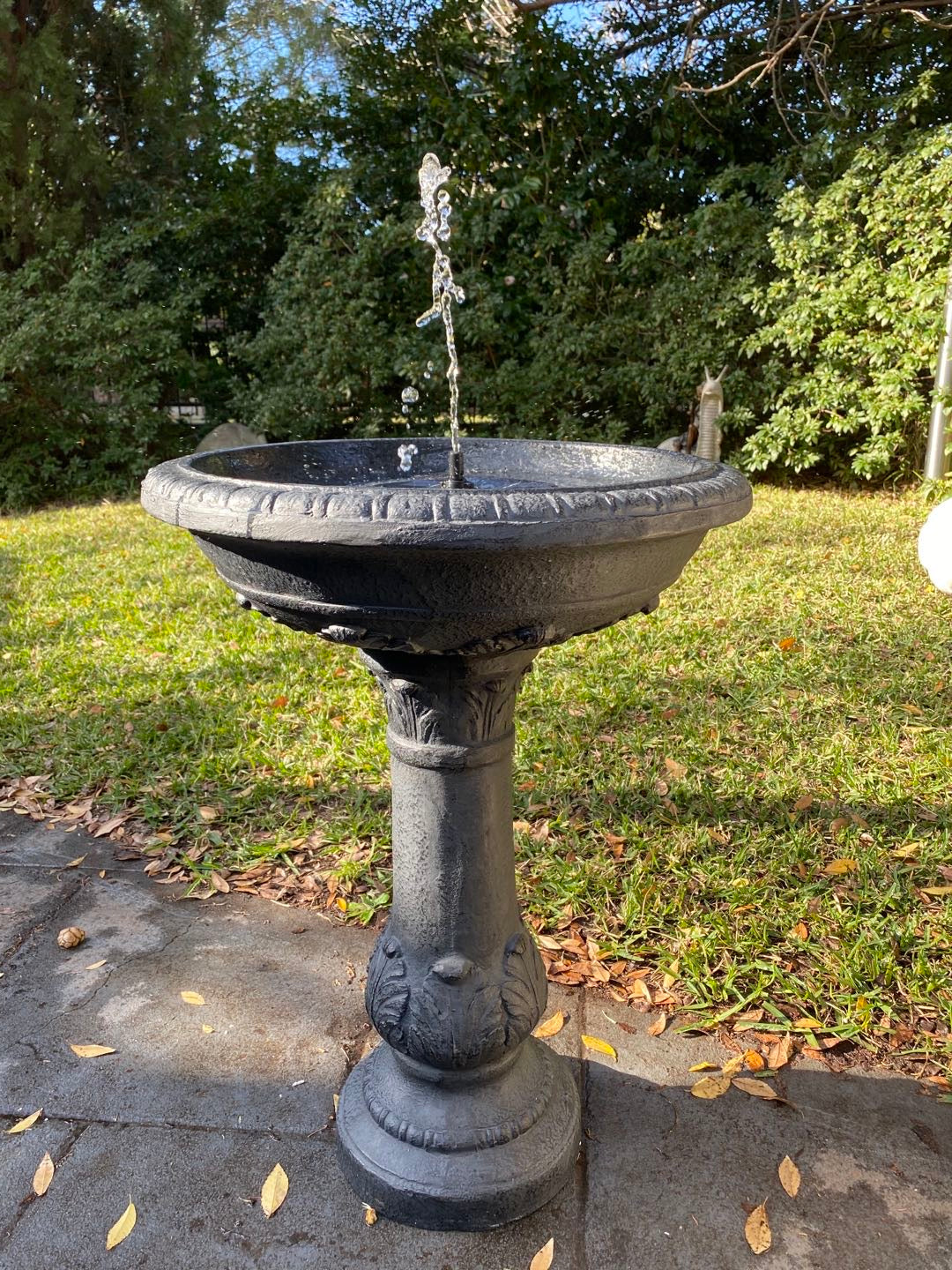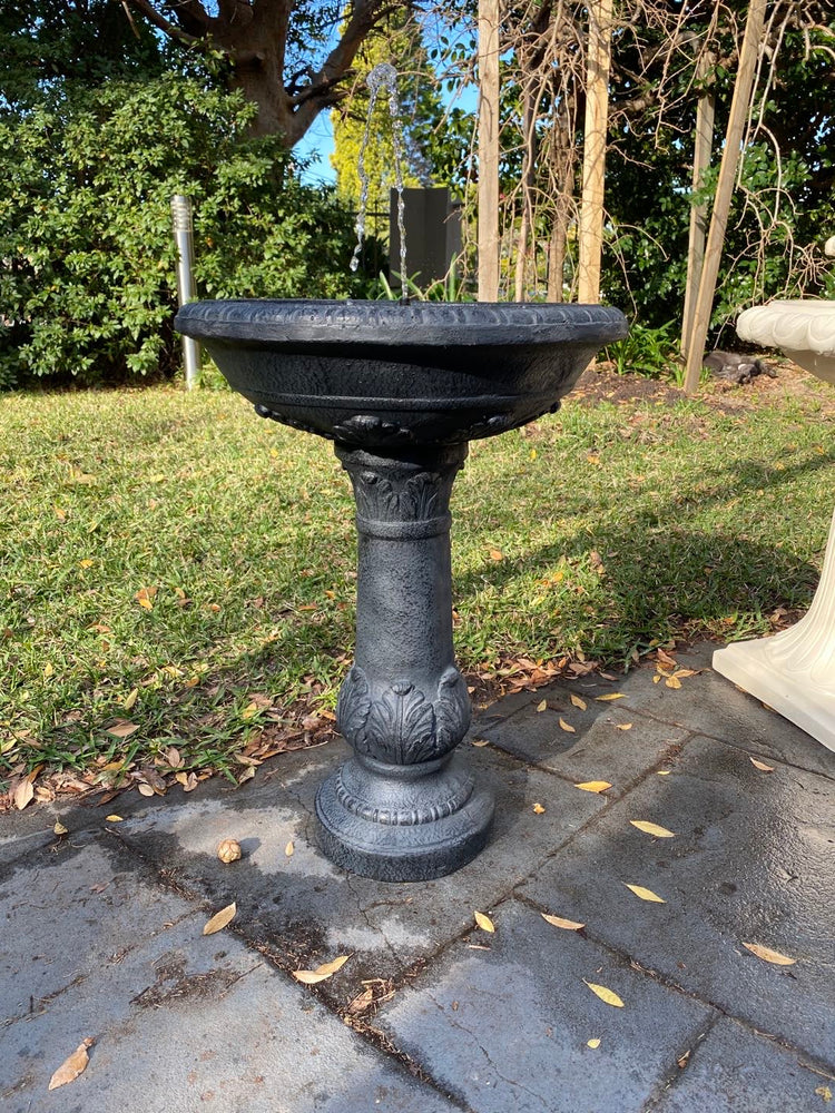 This water feature is striking in dark polyresin, reminiscent of Victorian iron garden ornaments. Add a touch of classical style to any space in your garden. This product is self-contained and solar powered, meaning you can position it anywhere, even paved or decked areas.