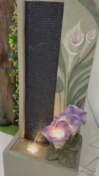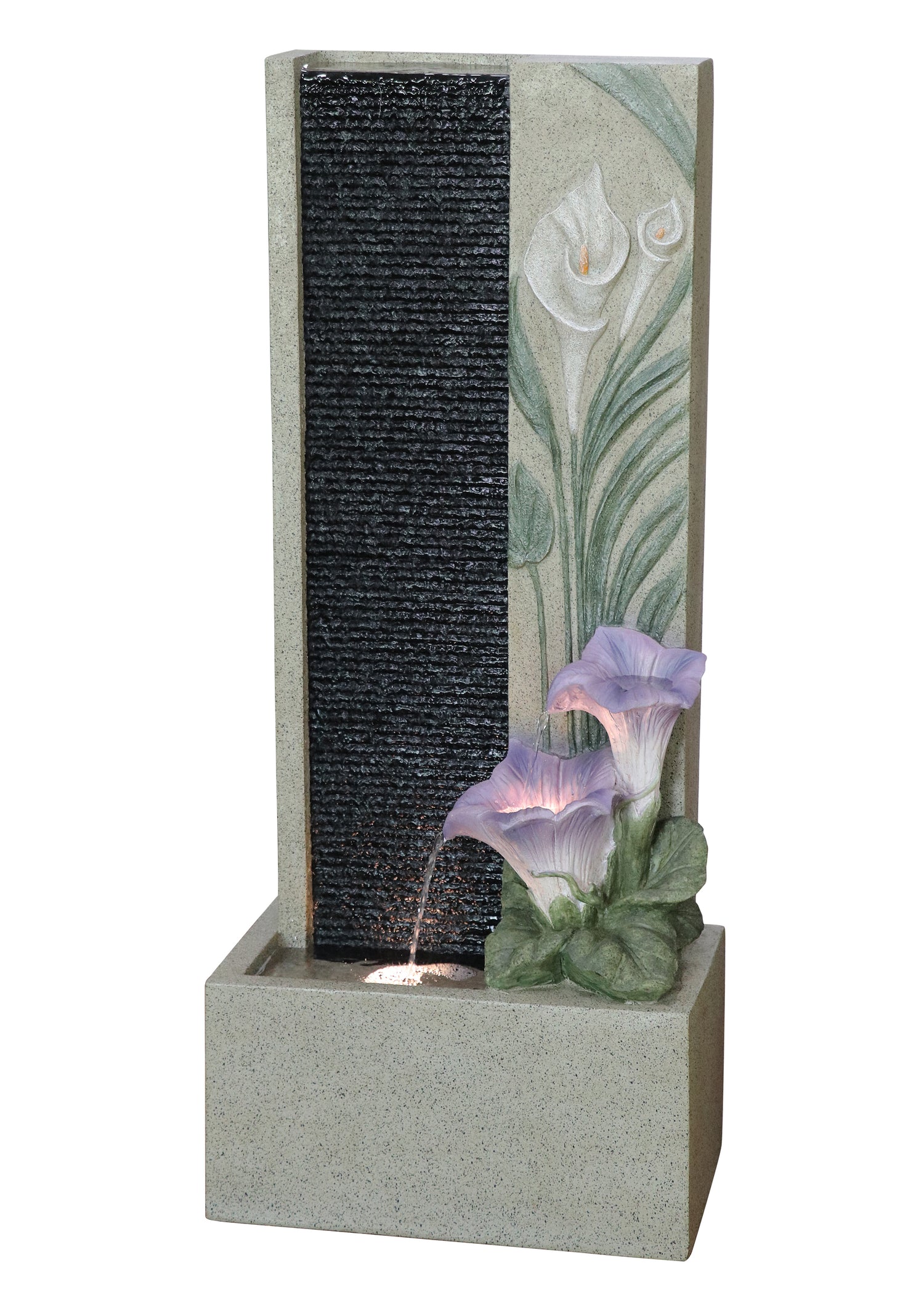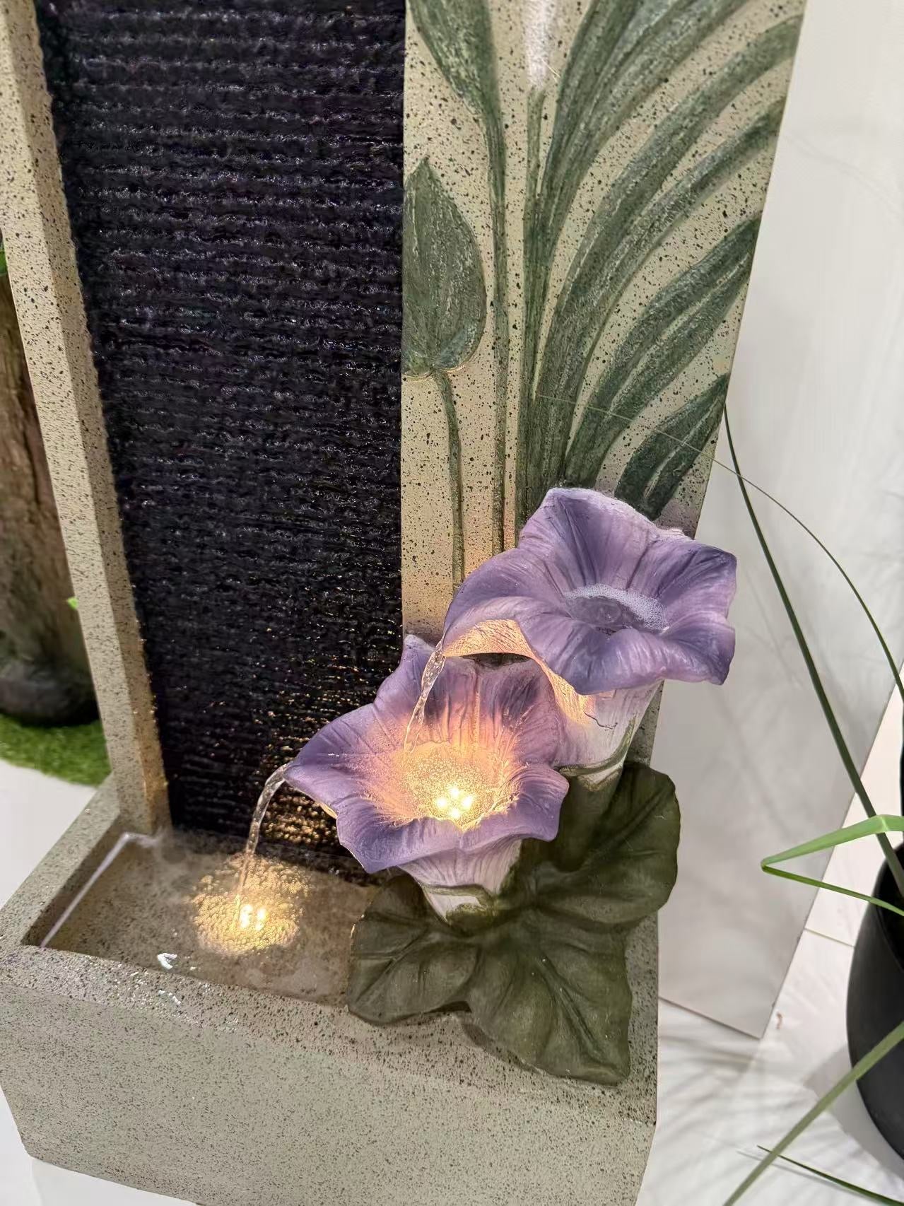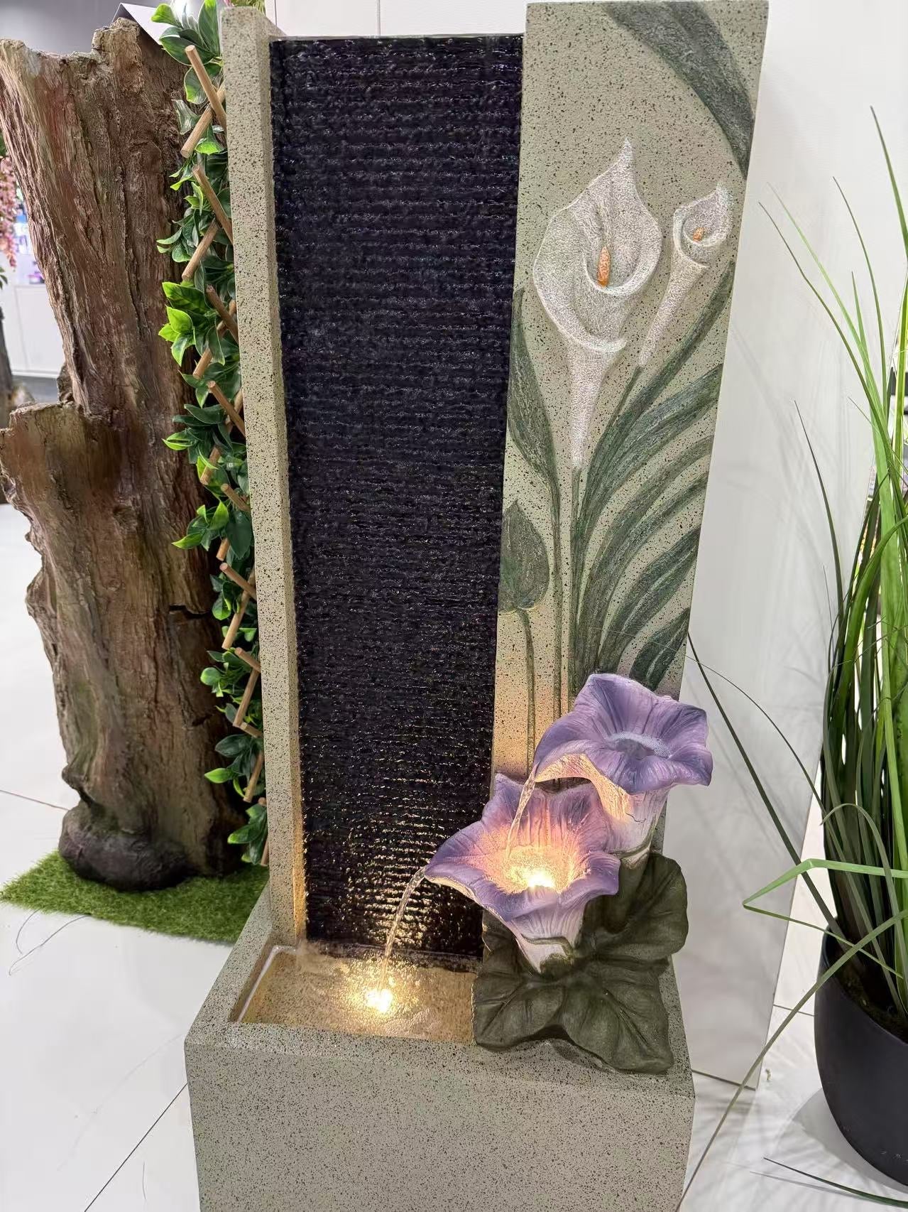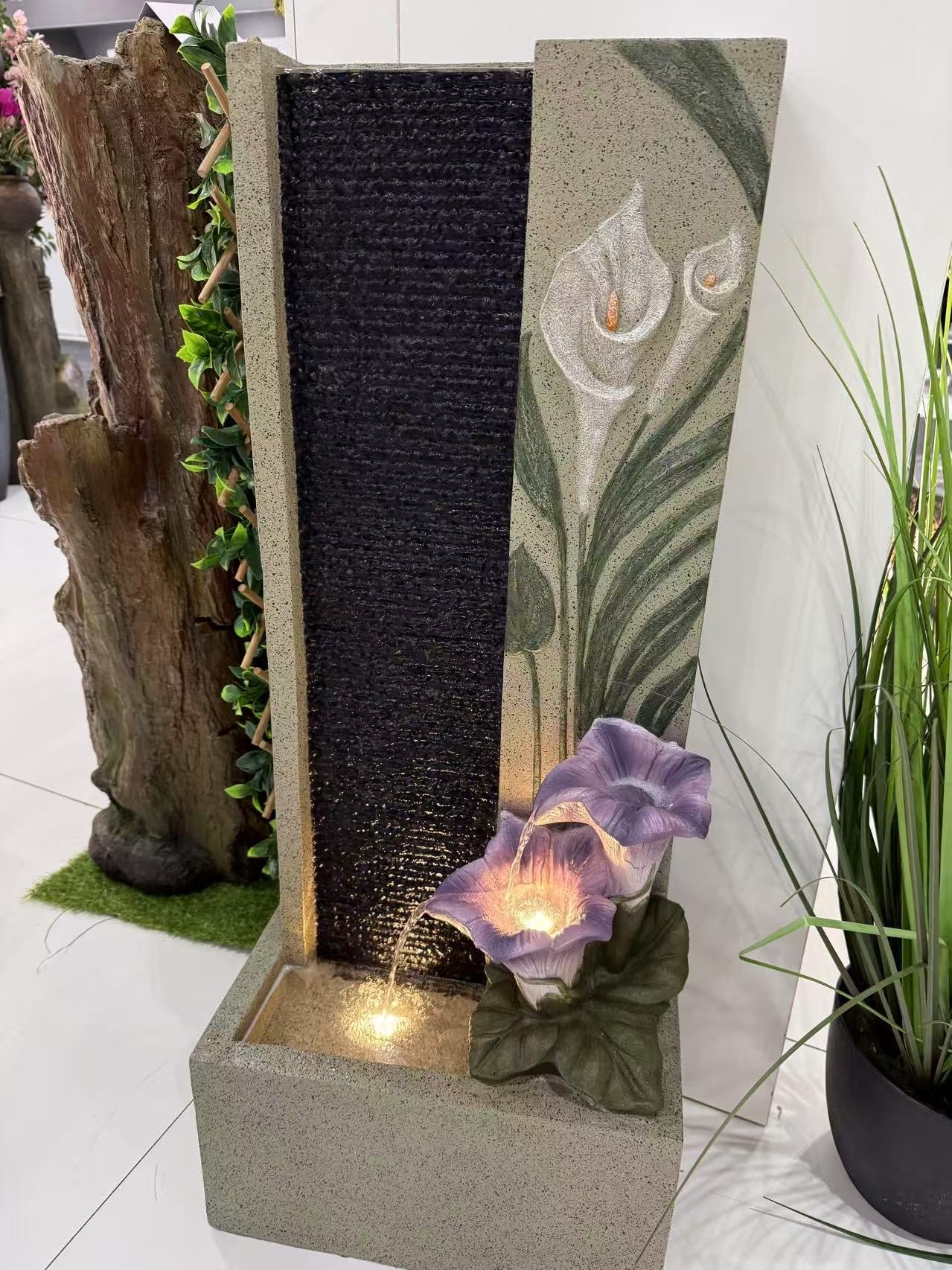 Comes in beige stone with leaves. Featuring a stunning Colourful Tulips on Water Wall.