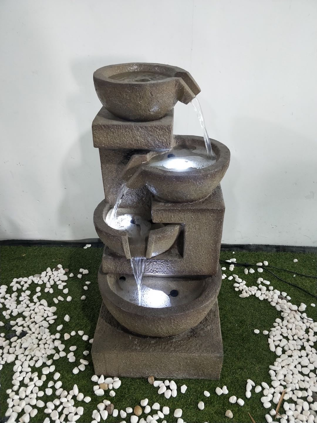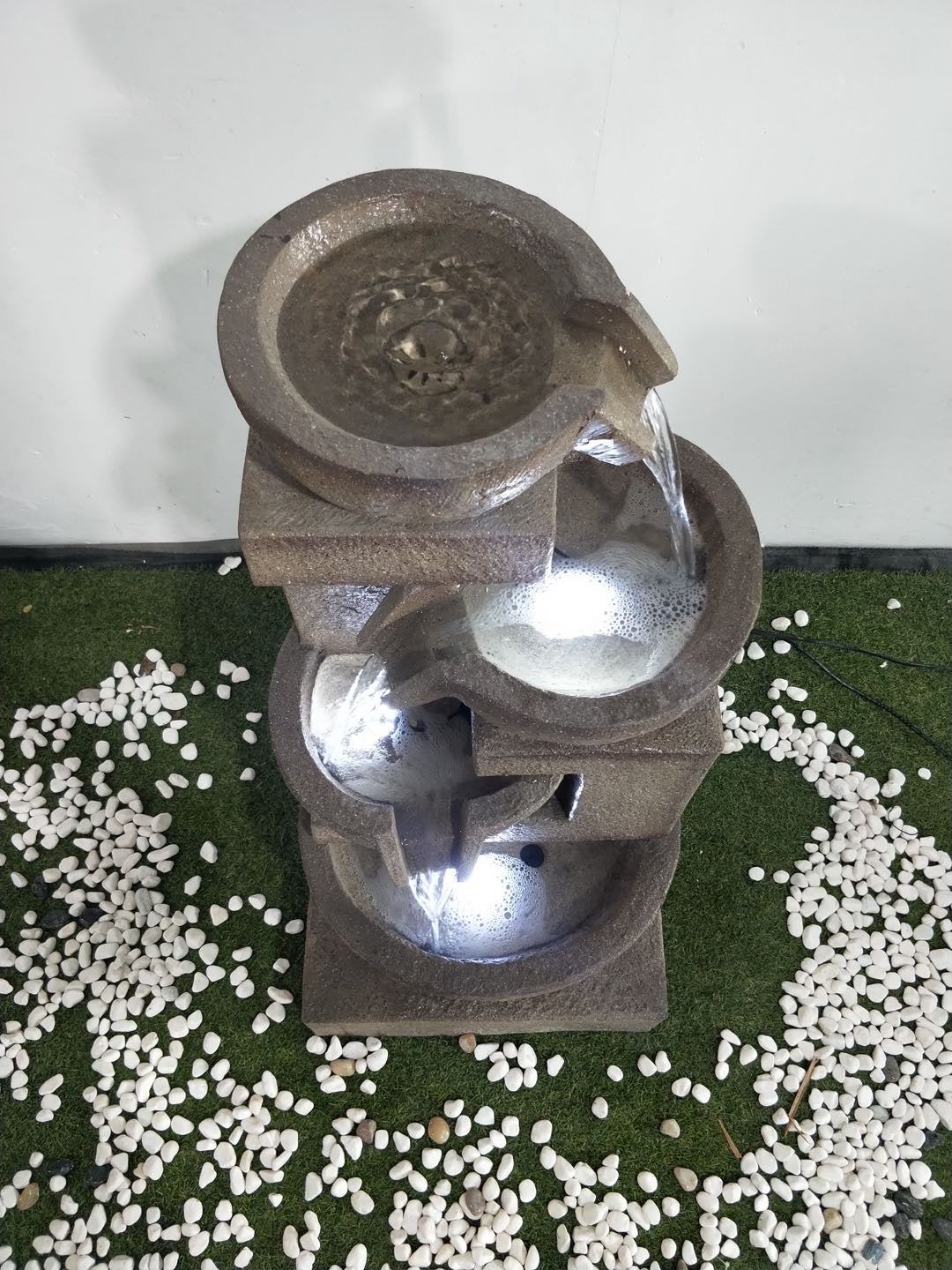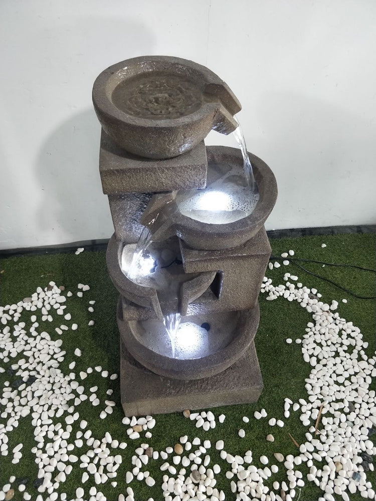 This is a premium designer quality fountain suitable for indoor & outdoor locations. The design combines traditional & contemporary concepts. This is truly an amazing water feature producing amazing visual effects with water & lights as well as genuine water sounds from the 5 levels and 4 drops.