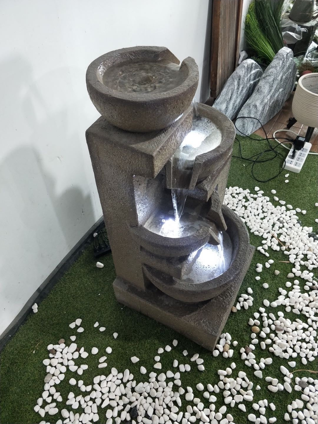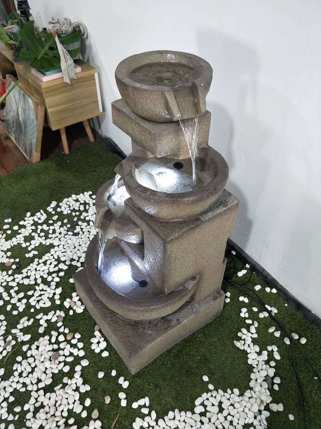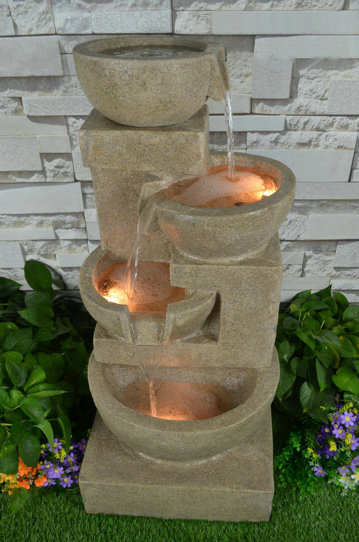 This is a premium designer quality fountain suitable for indoor & outdoor locations. The design combines traditional & contemporary concepts. This is truly an amazing water feature producing amazing visual effects with water & lights as well as genuine water sounds from the 5 levels and 4 drops.