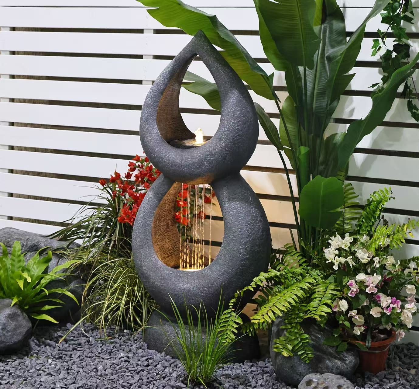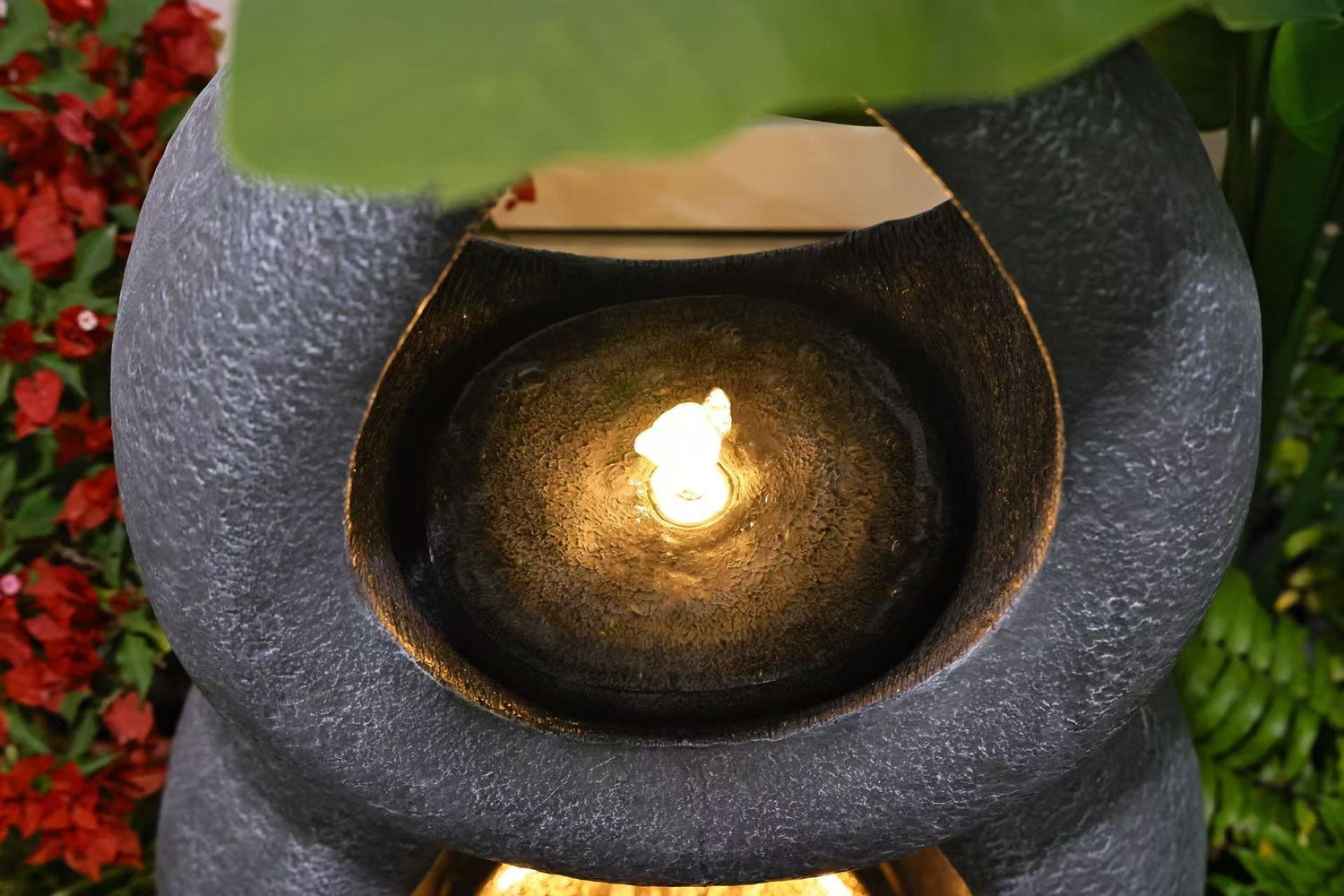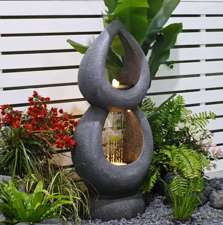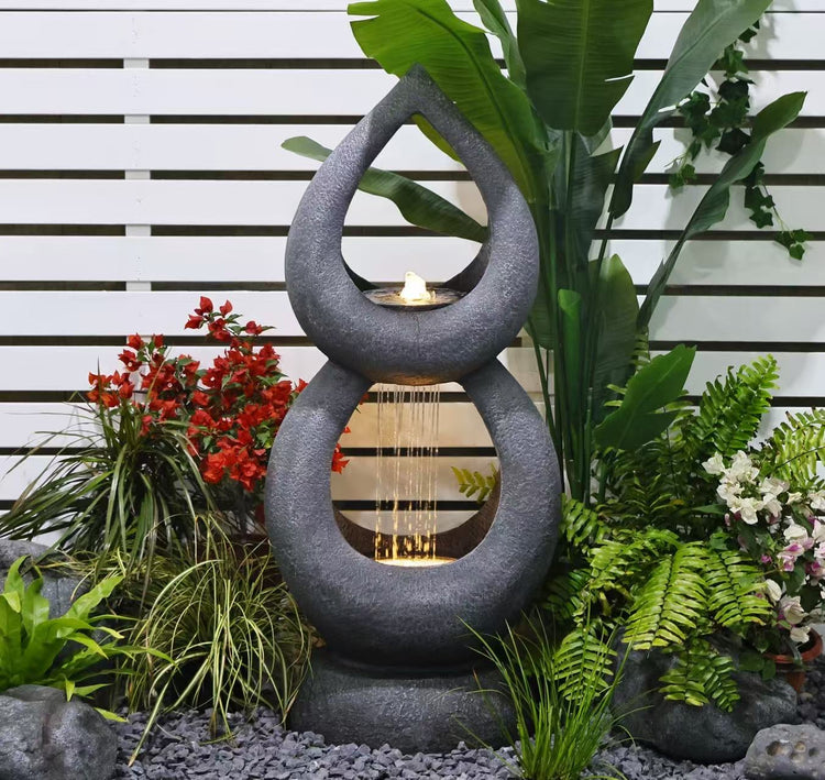 KIKI water feature has been beautifully crafted from polystone a mixture of cement and fiberglass to create this Rain Effect look before trickling down the face of the curtain on this Water Fountain. It is an authentic-looking piece that is certain to exude ideas of affluence and luxury in your home or garden, and it will indubitably make an impressive focal point in either setting.