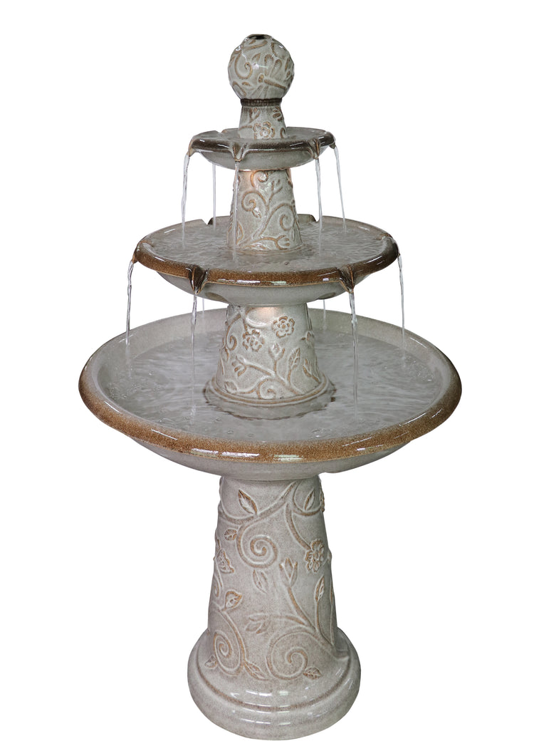 This round tiered ceramic fountain couples an elegant, classical fountain design with a set of modern improvements and accessories to create a truly unique piece. Electric powered and self-contained, this fountain requires little maintenance. The product also comes with a set of LED lights to accentuate the beauty and class of the piece even at night.
