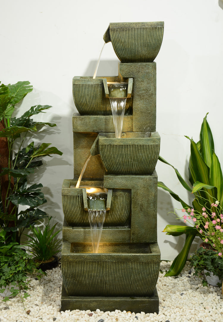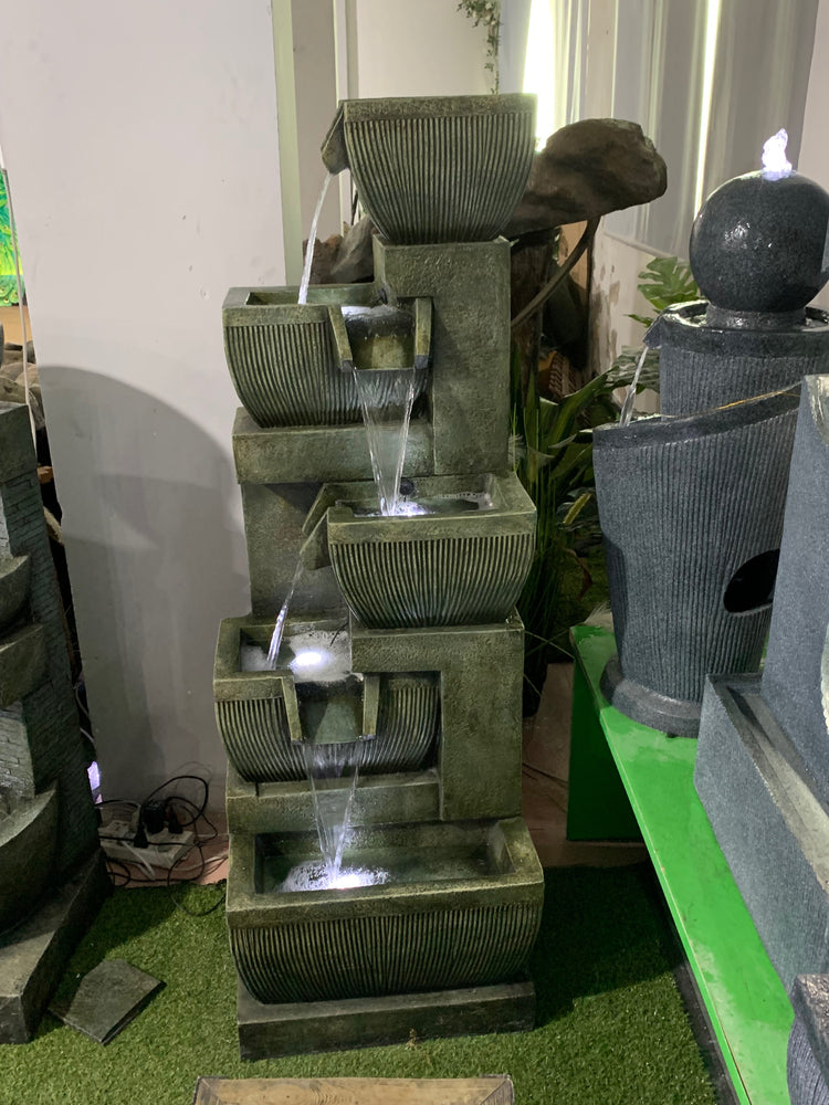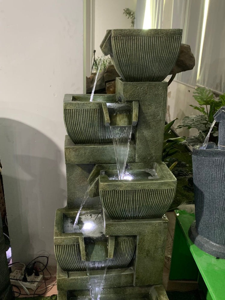 This is a premium designer quality fountain suitable for indoor & outdoor locations. The design combines traditional & contemporary concepts. This is truly an amazing water feature producing amazing visual effects with water & lights as well as genuine water sounds from the 5 levels and 4 drops.