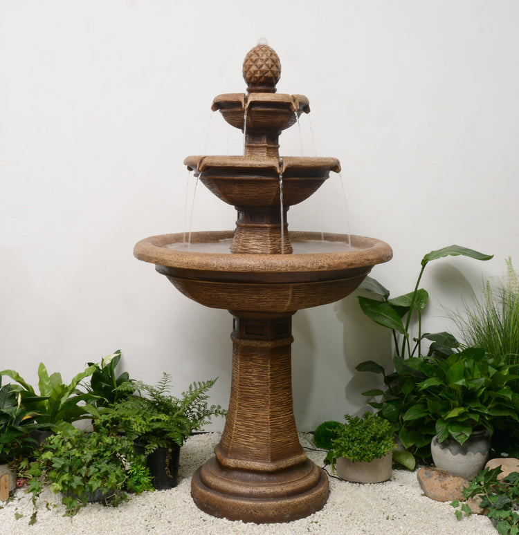 The water circulates from a reservoir hidden inside the feature and is pumped out of the pineapple on the top of the fountain, before gently spilling down through the final tier, ready to be pumped back up to start the cycle all over again.