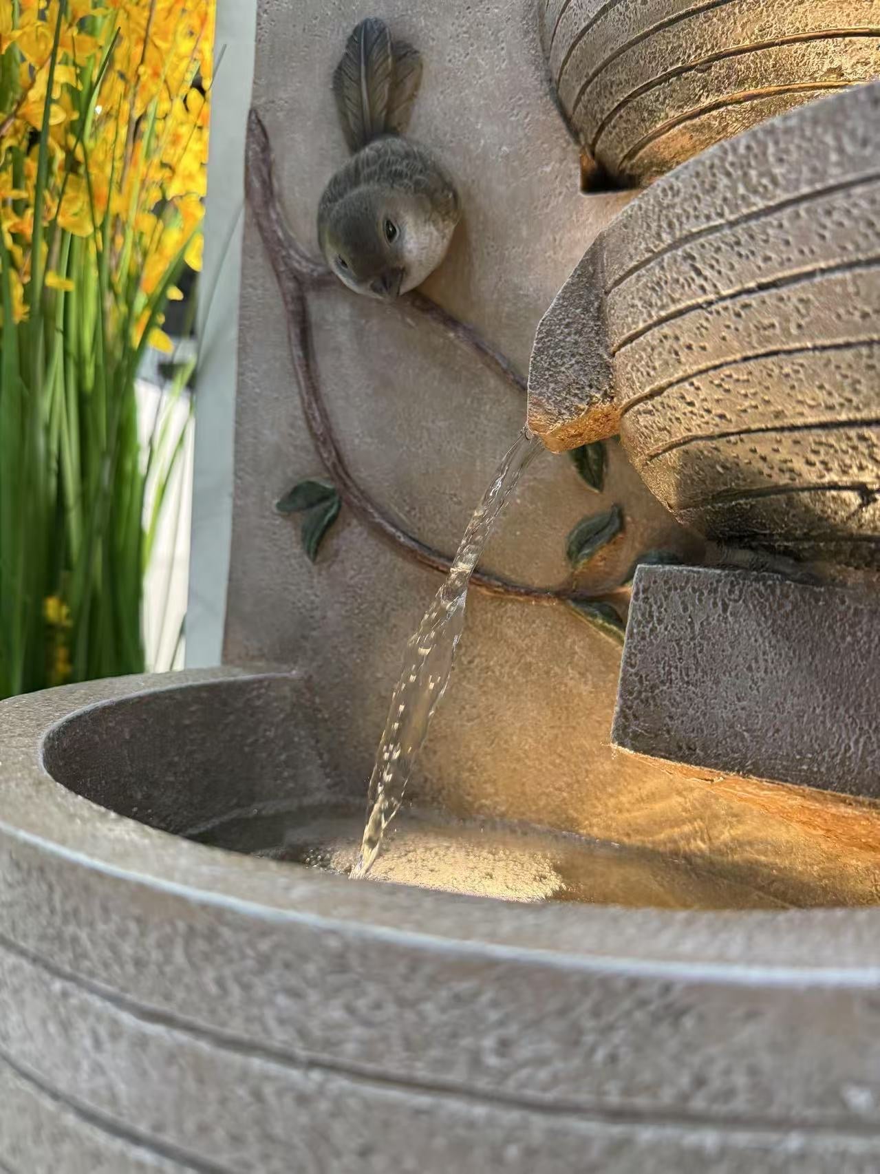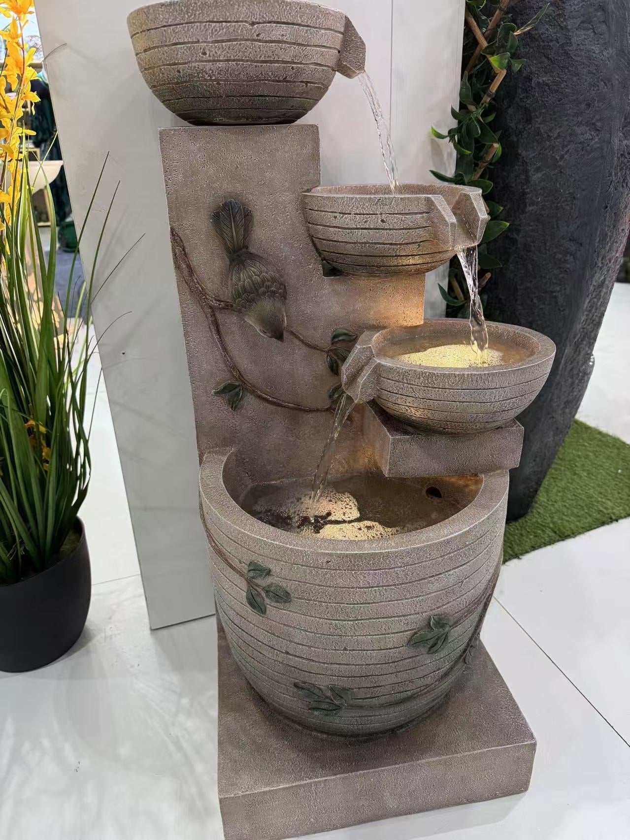 Comes in beige stone with leaves. Featuring a stunning Bird leaning to drink water.