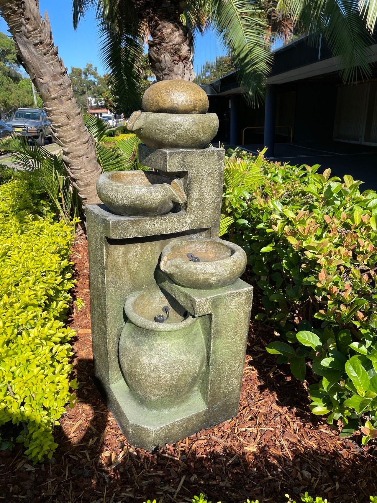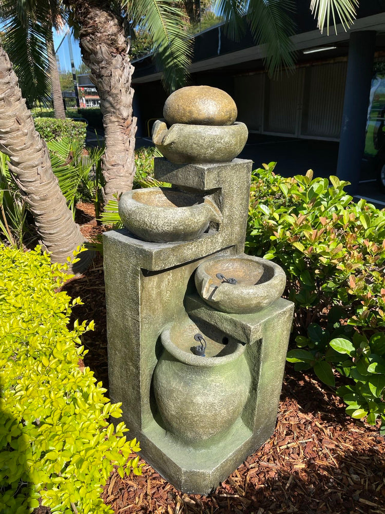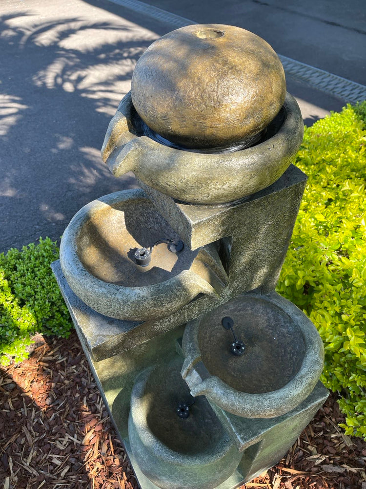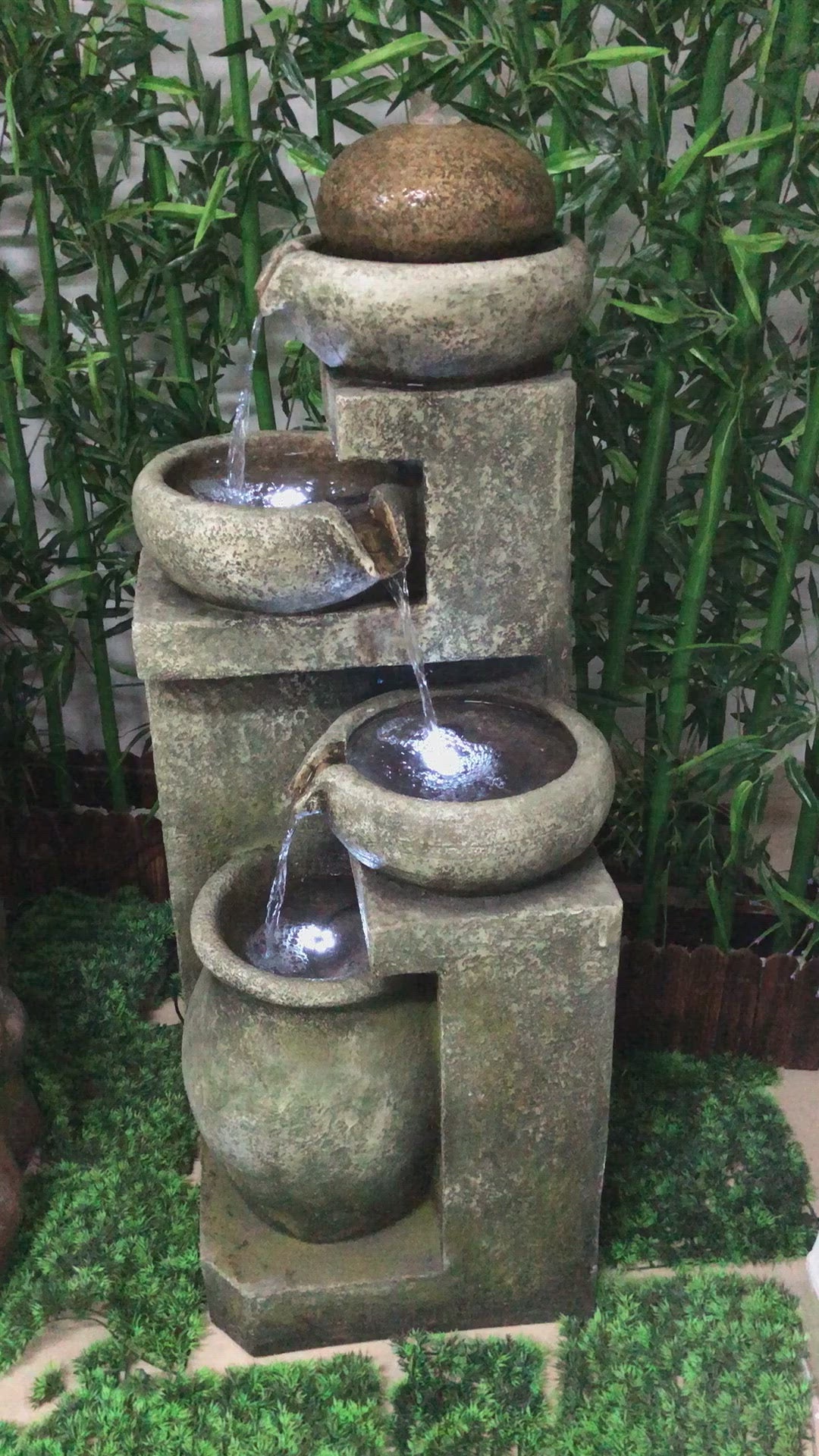 This is a premium designer quality fountain suitable for indoor & outdoor locations. The design combines traditional & contemporary concepts. This is truly an amazing water feature producing amazing visual effects with water & lights as well as genuine water sounds from the 4 levels and 3 drops.