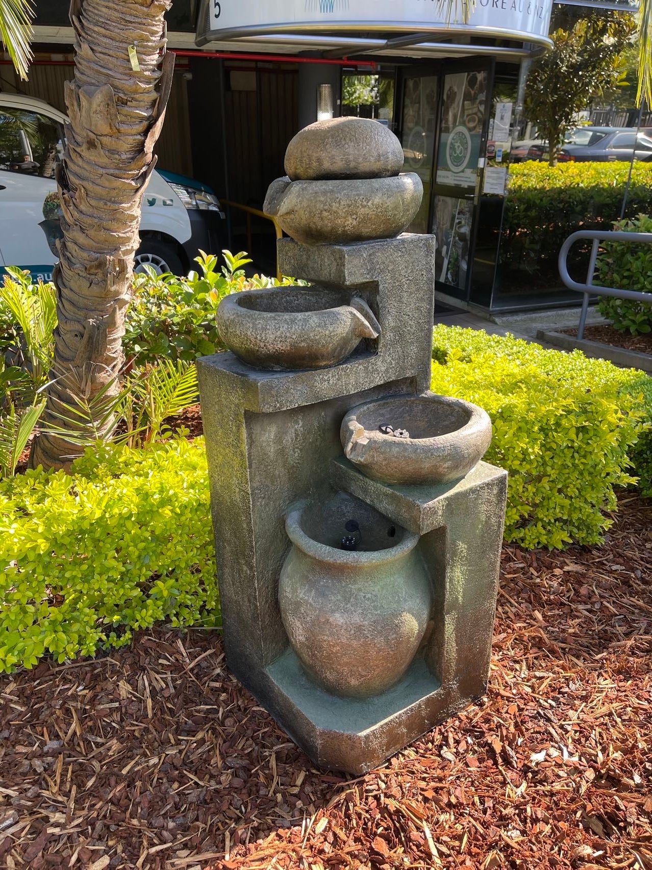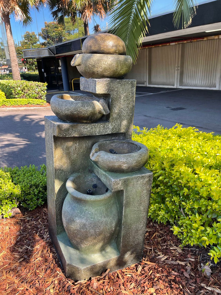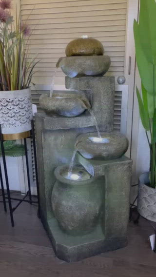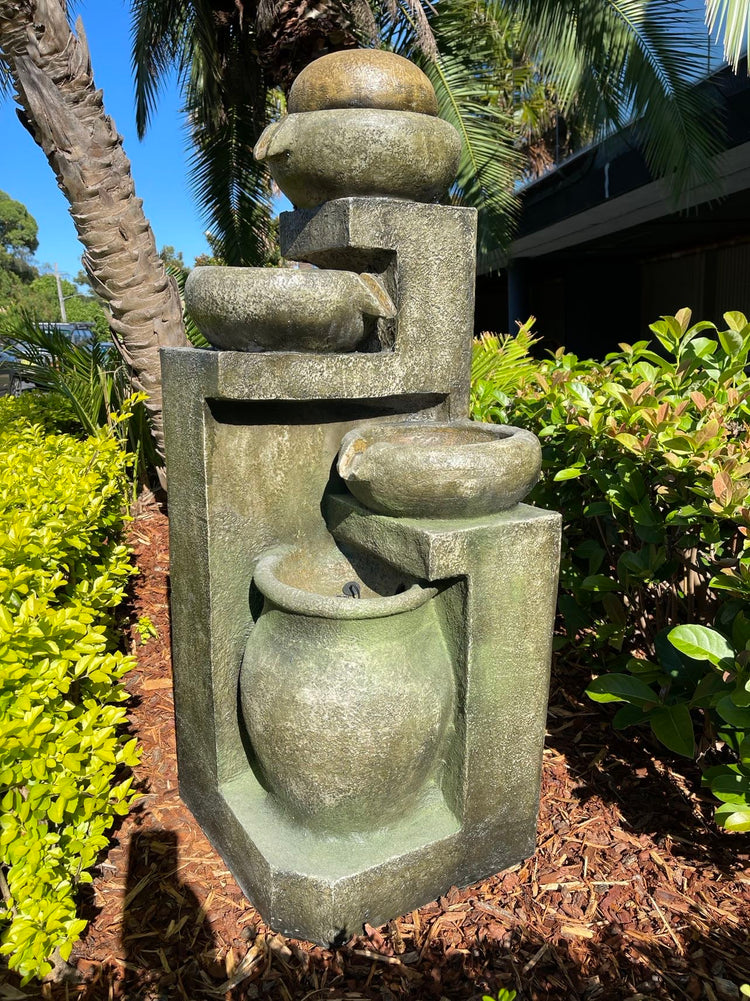 This is a premium designer quality fountain suitable for indoor & outdoor locations. The design combines traditional & contemporary concepts. This is truly an amazing water feature producing amazing visual effects with water & lights as well as genuine water sounds from the 4 levels and 3 drops.