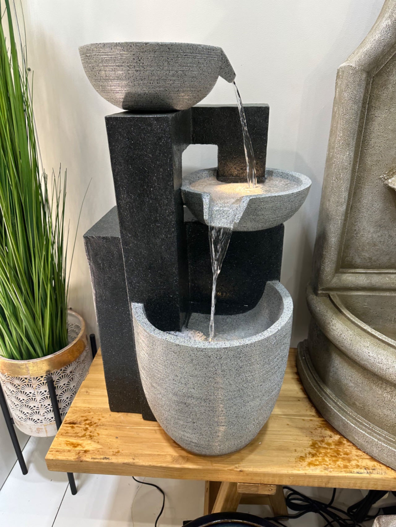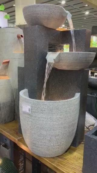 This is truly an amazing water feature producing amazing visual effects with water & lights as well as genuine water sounds from the 3 levels and 2 drops. With a planter at top level of the fountain.