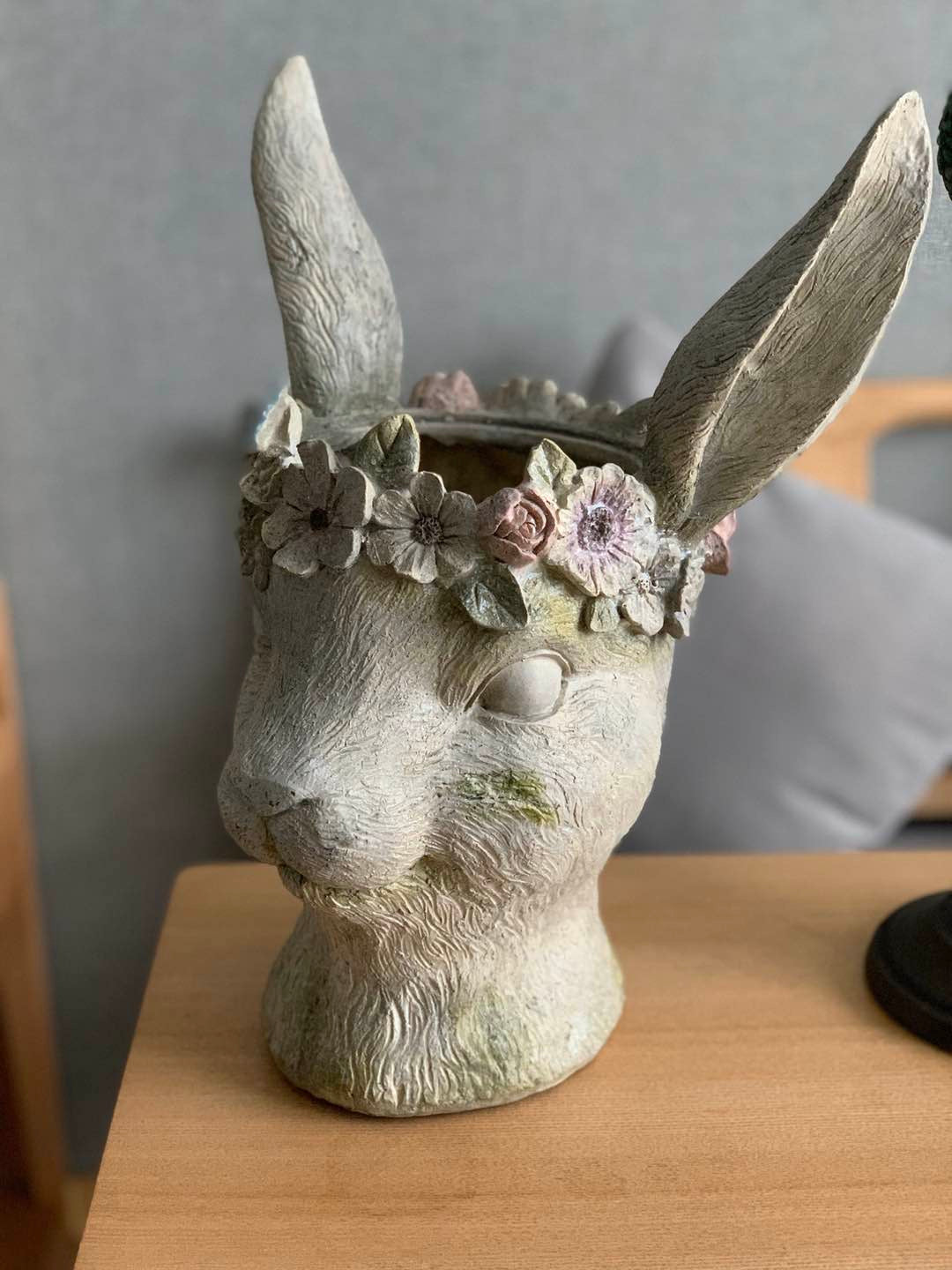 Our new designed Rabbit Head Planter shaped ornament with serene beautiful face in grey with hints of pink, purple & light blue flowers & butterflies.