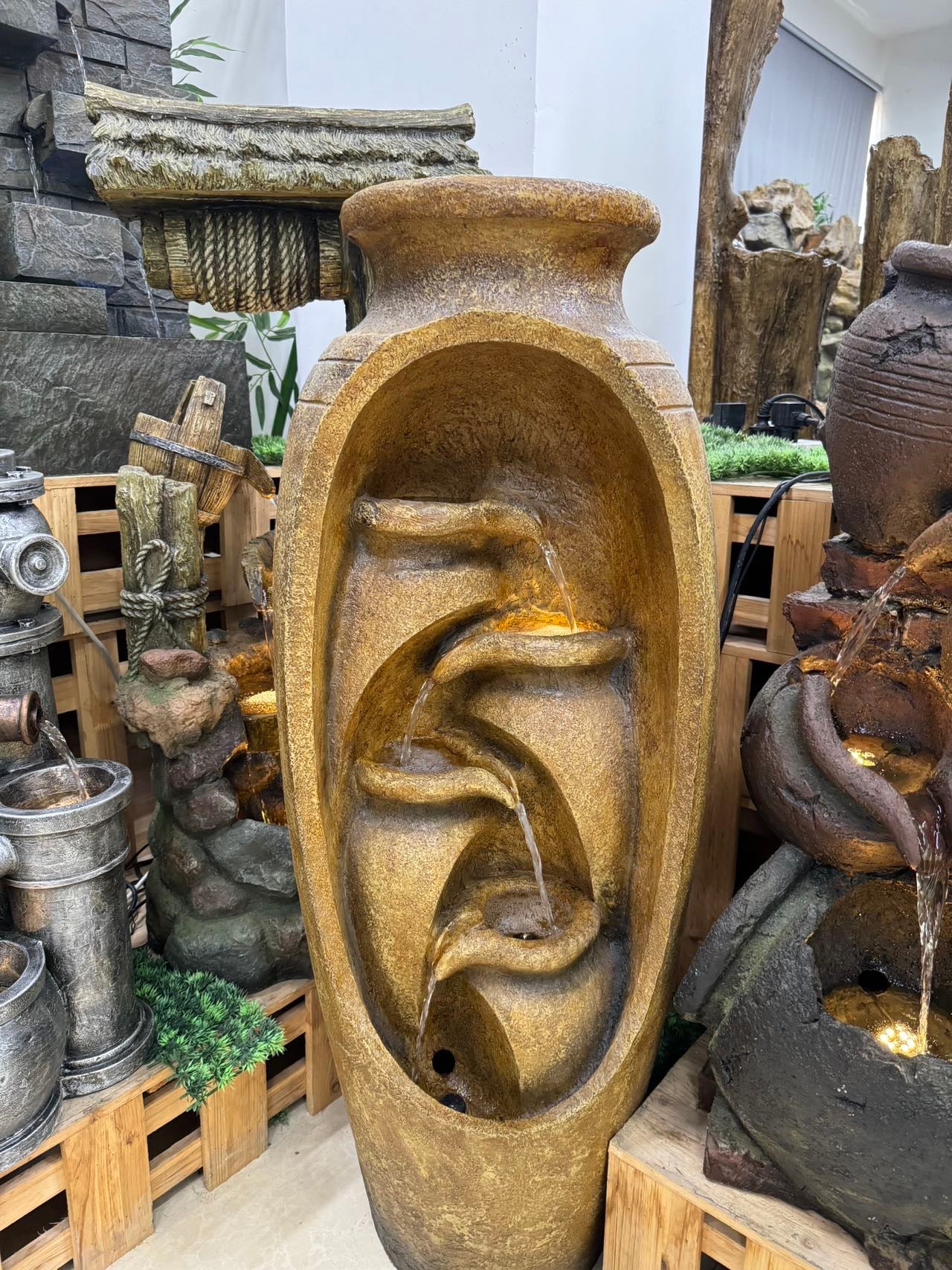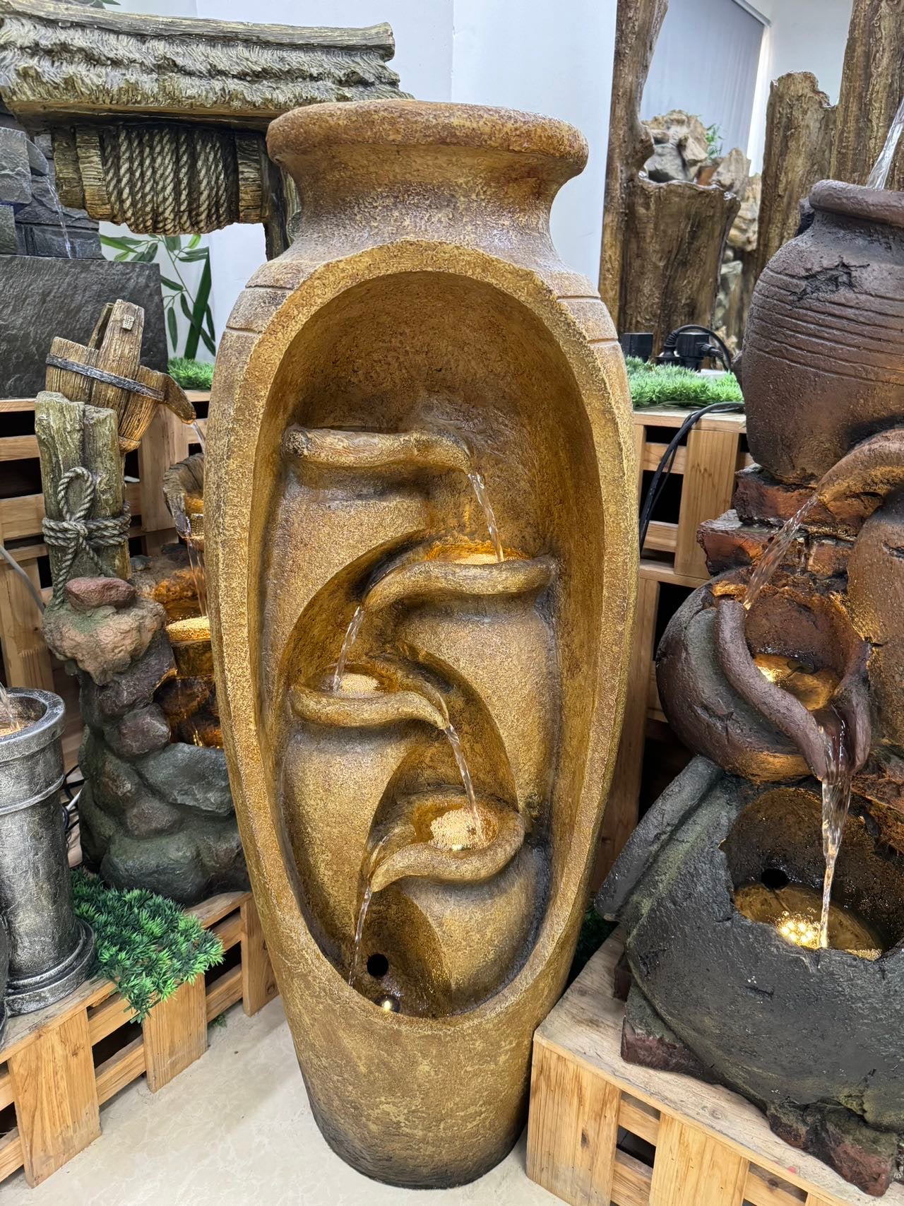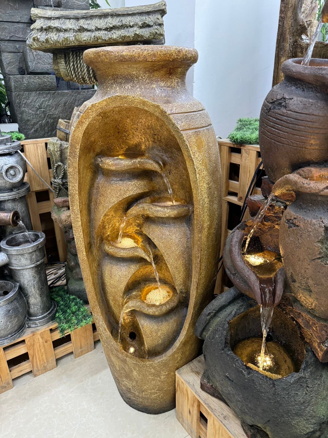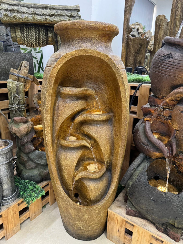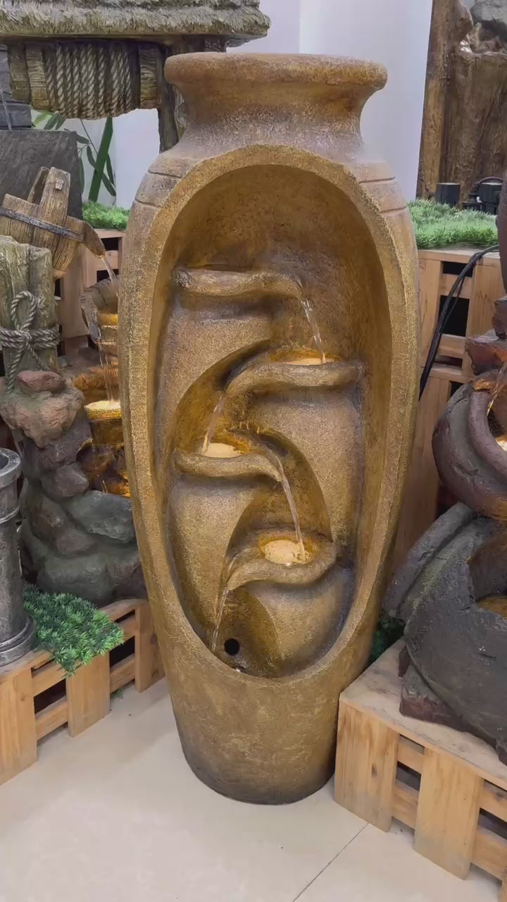 Ideal Outdoor or Indoor water features. Also a perfect companion for pools and as a water fall into pool when placed at vicinity of edge. Base acts as reservoir for water and also cocoon to lodge water pump.
